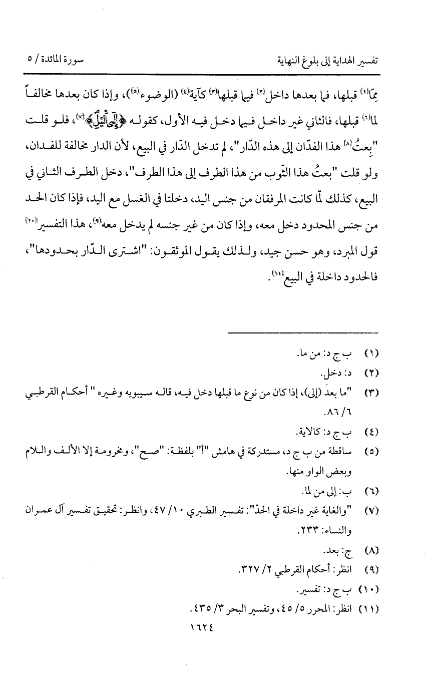 مِمّا قبلها، فما بعدها داخل فيما قبلها كآية (الوضوء)، وإذا كان بعدها مخالفاً لما قبلها، فالثاني غير داخل فيما دخل فيه الأول، كقوله {إِلَى الليل}، فلو قلت " بِعتُ هذا الفدّان إلى هذه الدّار "، لم تدخل الدّار في البيع، لأن الدار مخالفة للفدان، ولو قلت " بعتُ هذا الثّوب من هذا الطرف إلى هذا الطرف "، دخل الطرف الثاني في البيع، كذلك لمّا كانت المرفقان من جنس اليد، دخلتا في الغسل مع اليد، فإذا كان الحد من جنس المحدود دخل معه، وإذا كان من غير جنسه لم يدخل معه، هذا التفسير قول المبرد، وهو حسن جيد، ولذلك يقول الموثقون: " اشترى الدّار بحدودها "، فالحدود داخلة في البيع.