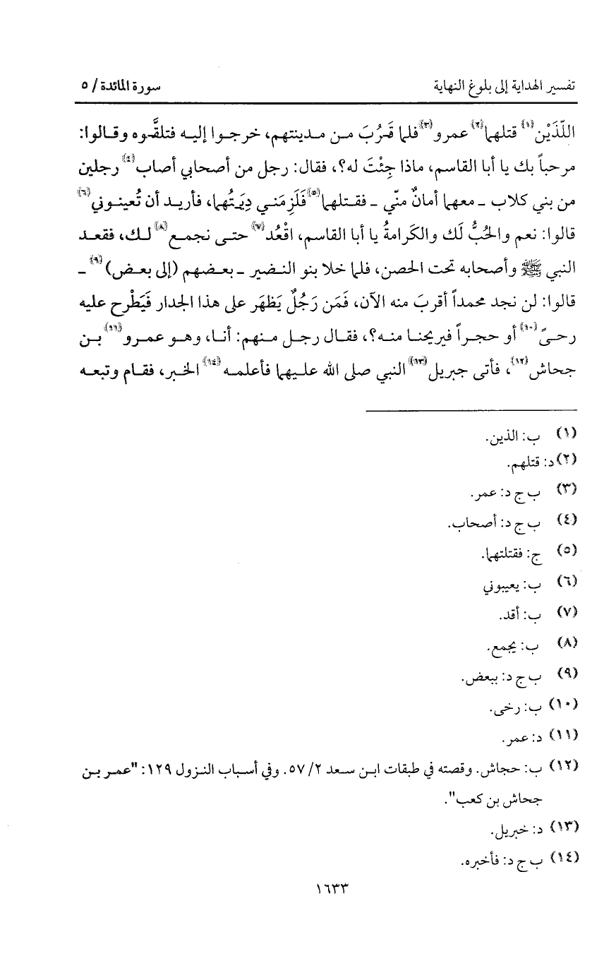 اللّذَيْن قتلهما عمرو فلما قَرُبَ من مدينتهم، خرجوا إليه فتلقَّوه وقالوا: مرحباً بك يا أبا القاسم، ماذا جِئْتَ له؟، فقال: رجل من أصحابي أصاب رجلين من بني كلاب - معهما أمانٌ منّي - فقتلهما فَلَزِمَني دِيَتُهما، فأريد أن تُعينوني قالوا: نعم والحُبُّ لَك والكَرامةُ يا أبا القاسم، اقْعُد حتى نجمع لك، فقعد النبي A وأصحابه تحت الحصن، فلما خلا بنو النضير - بعضهم (إلى بعض) - قالوا: لن نجد محمداً أقربَ منه الآن، فَمَن رَجُلٌ يَظهَر على هذا الجدار فَيَطْرح عليه رحىً أو حجراً فيريحنا منه؟، فقال رجل منهم: أنا، وهو عمرو بن جحاش، فأتى جبريل النبي صلى الله عليهما فأعلمه الخبر، فقام وتبعه