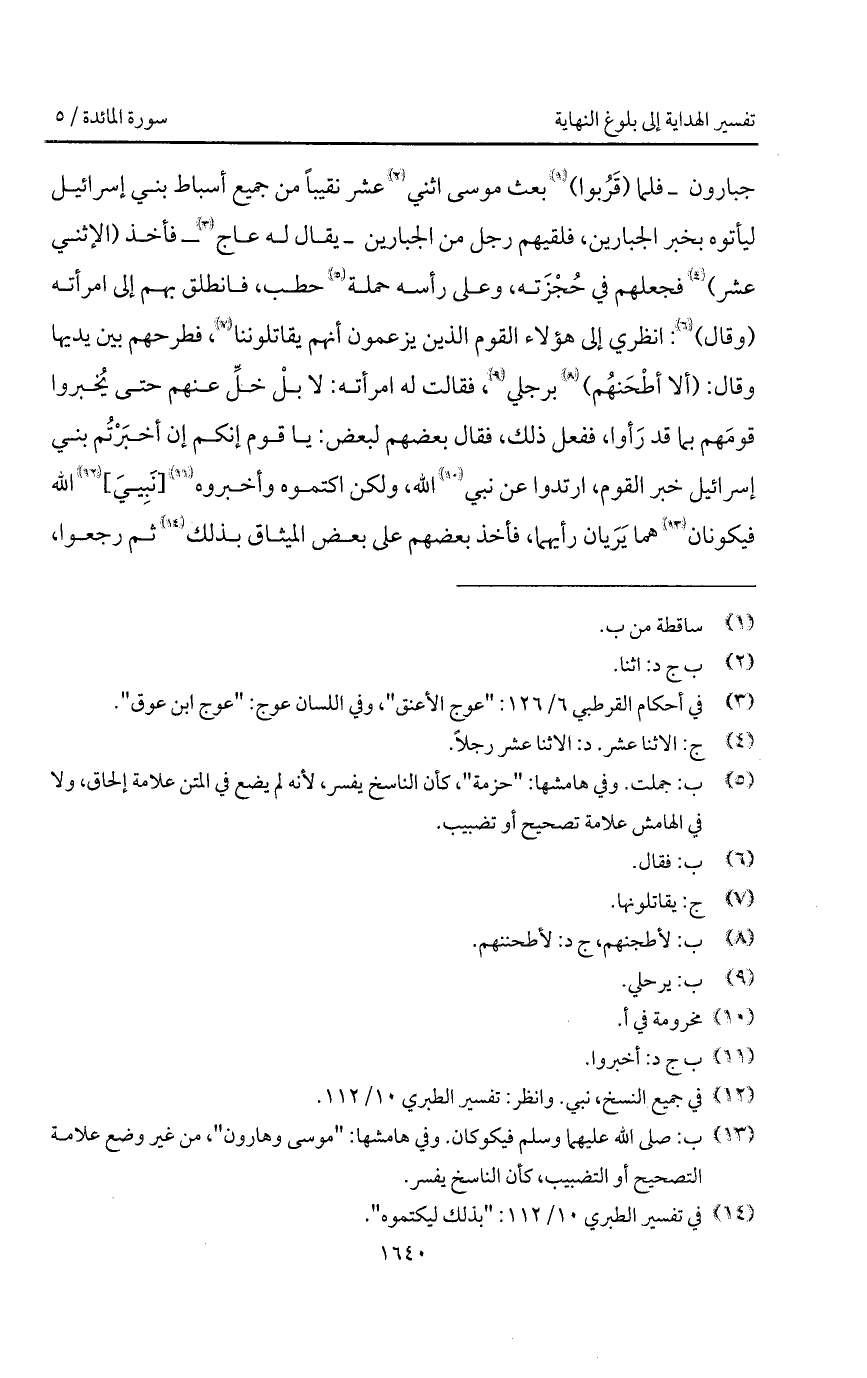 جبارون - فلما (قَرُبوا) بعث موسى اثني عشر نقيباً من جميع أسباط بني إسرائيل ليأتوه بخبر الجبارين، فلقيهم رجل من الجبارين - يقال له عاج - فأخذ (الإثني عشر) فجعلهم في حُجْزَته، وعلى رأسه حملة حطب، فانطلق بهم إلى امرأته (وقال): انظري إلى هؤلاء القوم الذين يزعمون أنهم يقاتلوننا، فطرحهم بين يديها وقال: (ألا أطْحَنهُم) برجلي، فقالت له امرأته: لا بلْ خلِّ عنهم حتى يُخبروا قومَهم بما قد رَأوا، ففعل ذلك، فقال بعضهم لبعض: يا قوم إنكم إن أخبَرْتُم بني إسرائيل خبر القوم، ارتدوا عن نبي الله، ولكن اكتموه وأخبروه [نَبِييَ] الله فيكونان هما يَرَيان رأيهما، فأخذ بعضهم على بعض الميثاق بذلك ثم رجعوا،