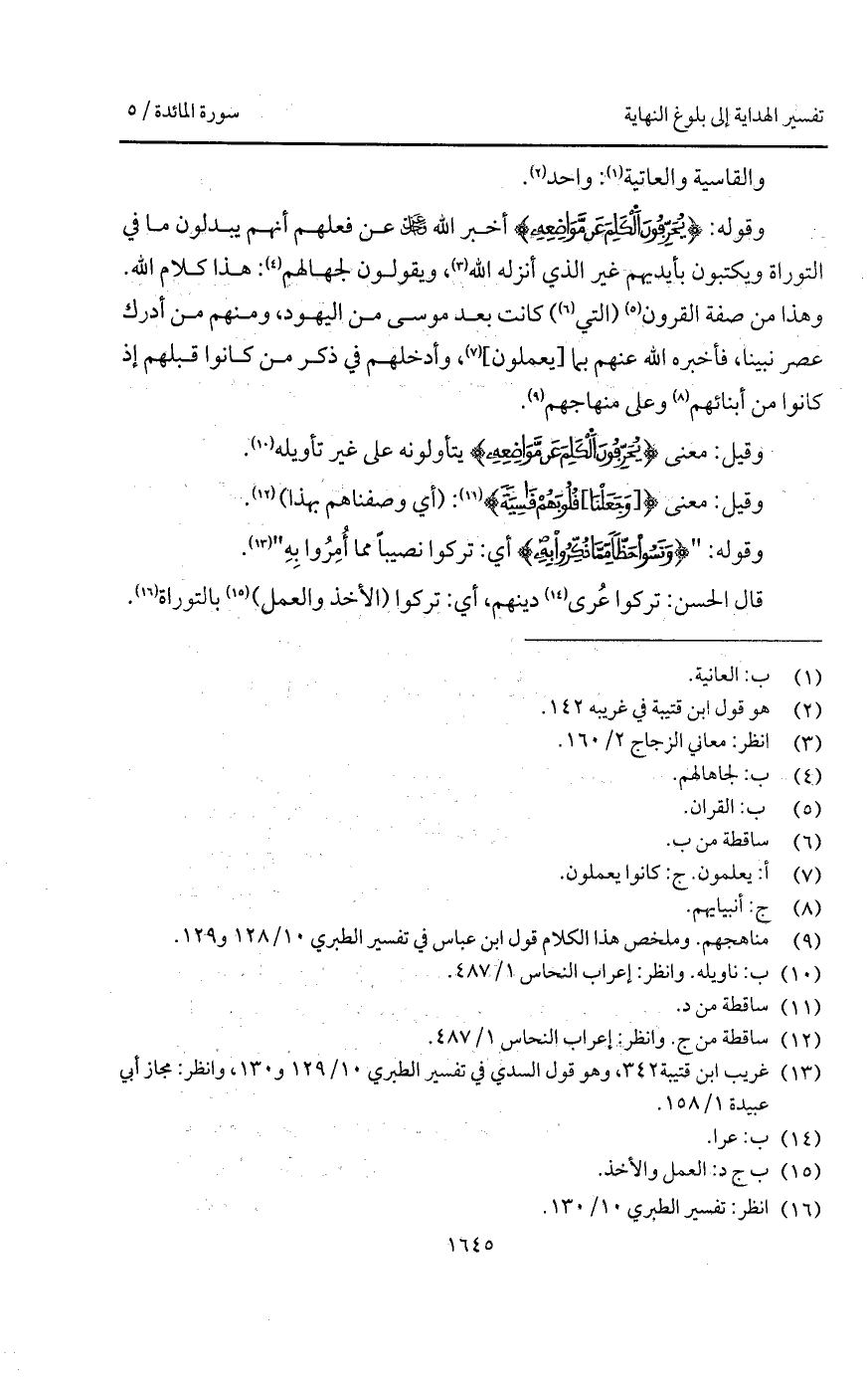 وقوله: {يُحَرِّفُونَ الكلم عَن مَّوَاضِعِهِ} أخبر الله D عن فعلهم أنهم يبدلون ما في التوراة ويكتبون بأيديهم غير الذي أنزله الله، ويقولون لجهالهم: هذا كلام الله. وهذا من صفة القرون (التي) كانت بعد موسى من اليهود، ومنهم من أدرك عصر نبينا، فأخبره الله عنهم بما [يعملون]، وأدخلهم في ذكر ما كانوا قبلهم إذ كانوا من أبنائهم وعلى منهاجهم.