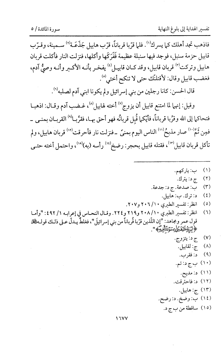 وقيل: إنهما لما امتنع قابيل أن يزوج أخته لهابيل، غضب آدم وقال: اذهبا فتحاكما إلى الله وقرِّبا قرباناً، فأيّكما قُبِل قربانُه فهو أحق بها، فقرَّبا القربان بمنى - فمِن ثَمَّ صار مذبحُ الناس اليوم بمنىً - فنزلت نار فأحرقت قربان هابيل، ولم تأكل قربان قابيل، فقتله قابيل بحجر: رضخ رأسه (به)، واحتمل أخته حتى