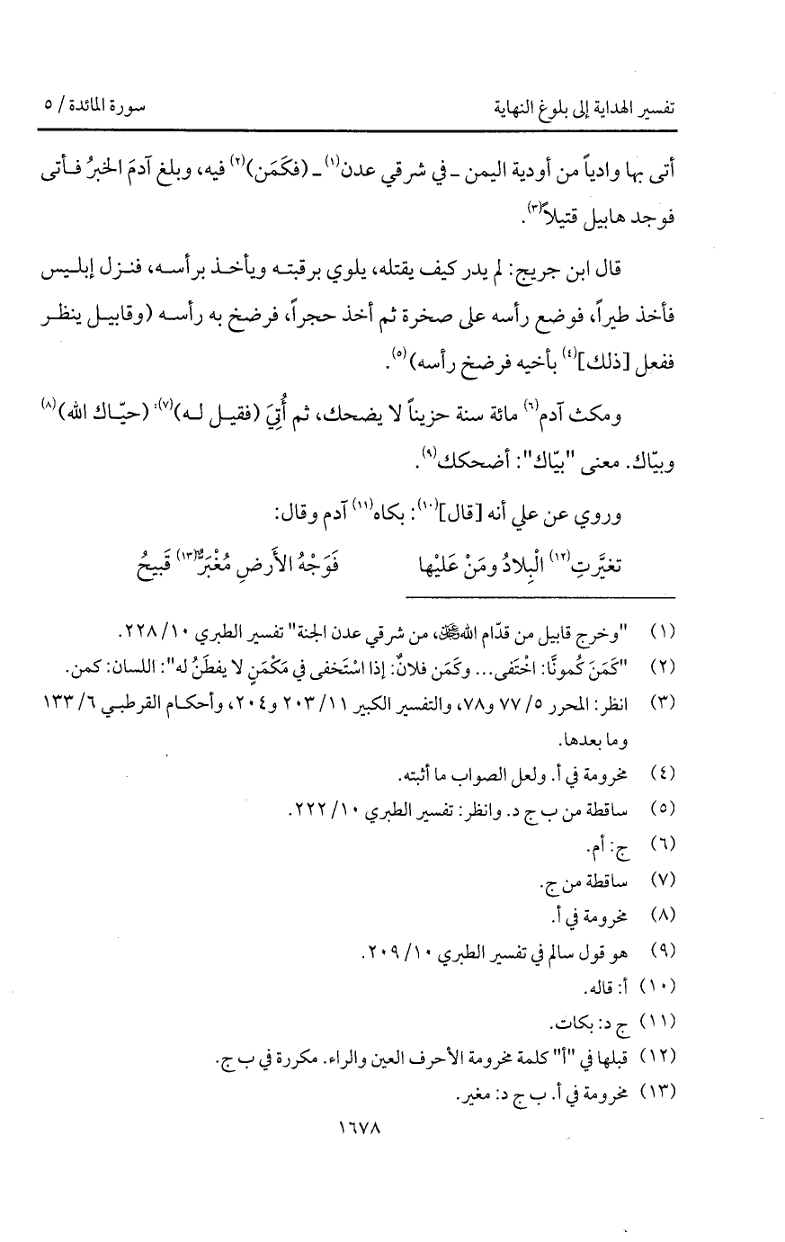 قال ابن جريج: لم يدر كيف يقتله، يلوي برقبته ويأخذ برأسه، فنزل إبليس فأخذ طيراً، فوضع رأسه على صخرة ثم أخذ حجراً، فرضخ به رأسه (وقابيل ينظر ففعل [ذلك] بأخيه فرضخ رأسه).