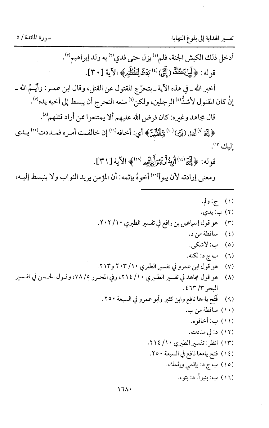 أخبر الله - في هذه الآية - بتحرّج المقتول عن القتل، وقال ابن عمر: وأيْمُ الله - إنْ كان المقتول لأشدَّ الرجلين، ولكن منعه التحرج أن يبسط إلى أخيه يده.