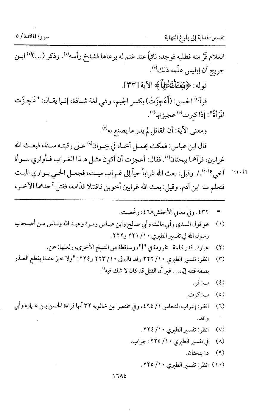 قال ابن عباس: فمكث يحمل أخاه في خِوان على رقبته سنة، فبعث الله غرابين، فرآهما يبحثان. فقال: أعجزت أن أكون مثل هذا الغراب فأواري سوأة أخي؟. / وقيل: بعث الله غراباً حياً إلى غراب ميت، فجعل الحي يواري الميت فتعلم منه ابن آدم. وقيل: بعث الله غرابين أخوين فاقتتلا قدّامه، فقتل أحدهما الآخر،