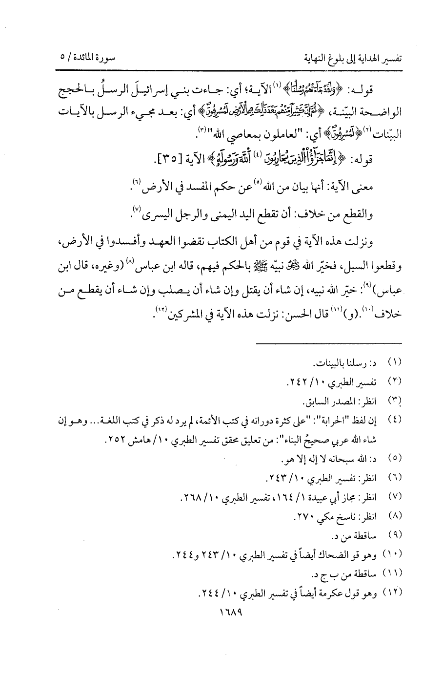 ونزلت هذه الآية في قوم من أهل الكتاب نقضوا العهد وأفسدوا في الأرض، وقطعوا السبل، فخيّر الله D نبيّه A بالحكم فيهم، قاله ابن عباس (وغيره، قال ابن عباس): خيّر الله نبيه، إن شاء أن يقتل وإن شاء أن يصلب وإن شاء أن يقطع من خلاف. (و) قال الحسن: نزلت هذه الآية في المشركين.