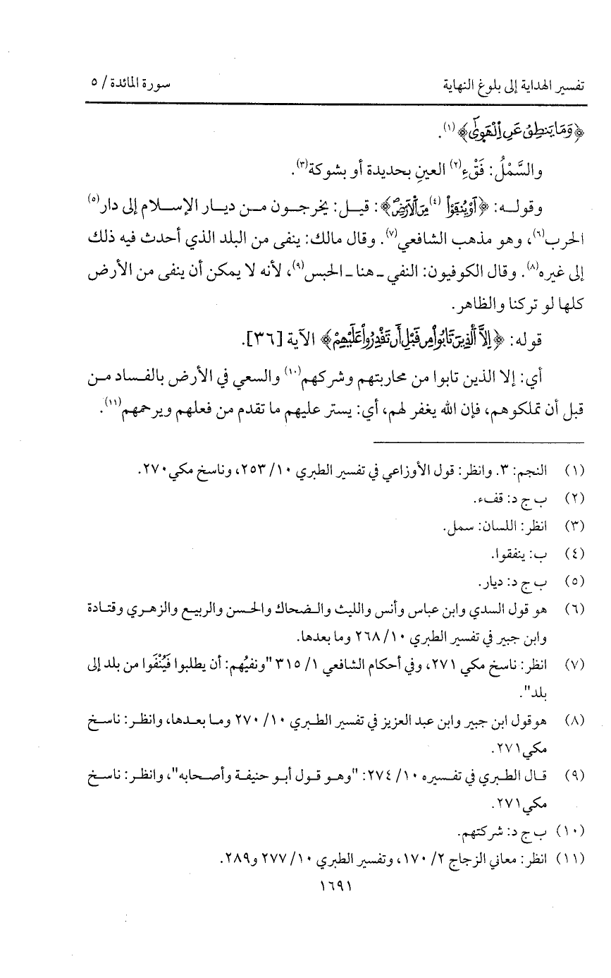 وقوله: {أَوْ يُنفَوْاْ مِنَ الأرض}: قيل: يخرجون من ديار الإسلام إلى دار الحرب، وهو مذهب الشافعي. وقال مالك: ينفى من البلد الذي أحدث فيه ذلك إلى غيره. وقال الكوفيون: النفي - هنا - الحبس، لأنه لا يمكن أن ينفى من الأرض كلها لو تركنا والظاهر.