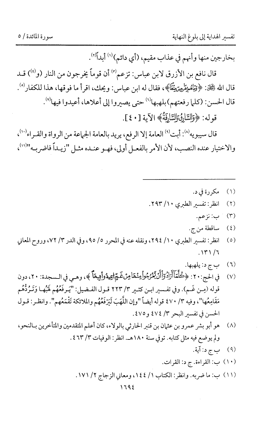 قال نافع بن الأزرق لابن عباس: تزعم أن قوماً يخرجون من النار (و) قد قال الله D: { وَمَا هُم بِخَارِجِينَ مِنْهَا}، فقال له ابن عباس: ويحك، اقرأ ما فوقها، هذا للكفار. قال الحسن: (كلما رفعتهم) بلهبها حتى يصيروا إلى أعلاها، أعيدوا فيها.