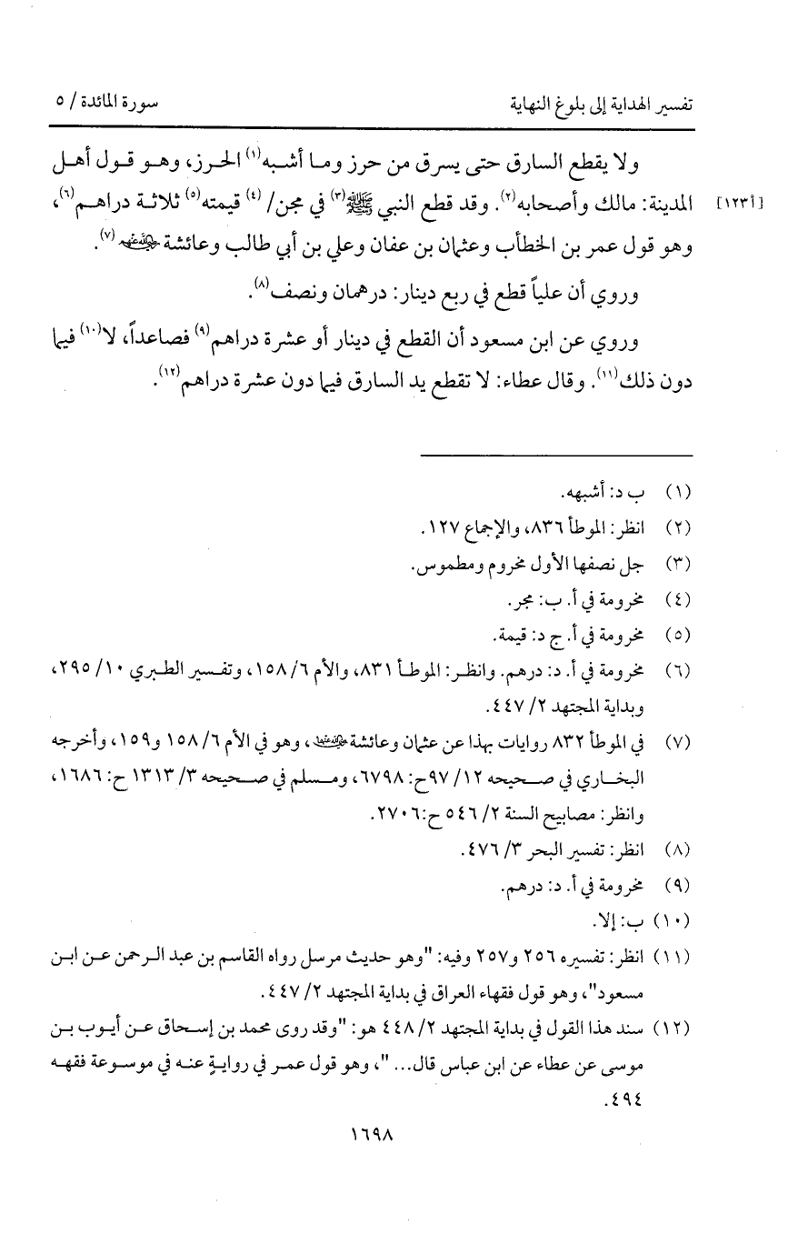 ولا يقطع السارق حتى يسرق من حرز وما أشبه الحرز، وهو قول أهل المدينة: مالك وأصحابه. وقد قطع النبي A في مجن / قيمته ثلاثة دراهم، وهو قول عمر بن الخطاب وعثمان بن عفان وعلي بن أبي طالب وعائشة Bهم.
