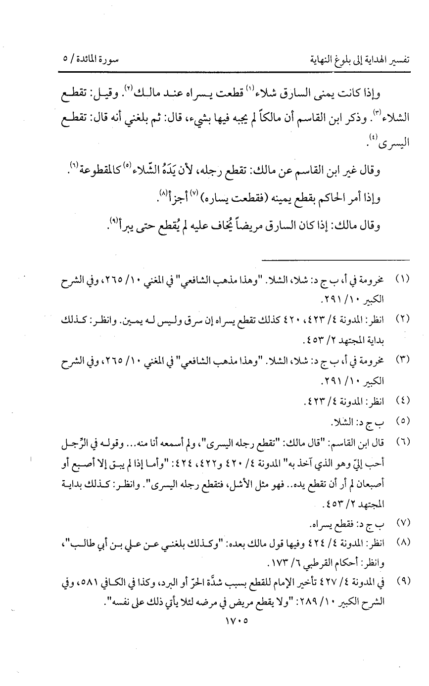 وقال غير ابن القاسم عن مالك: تقطع رجله، لأن يَدَهُ الشّلاء كالمقطوعة.
