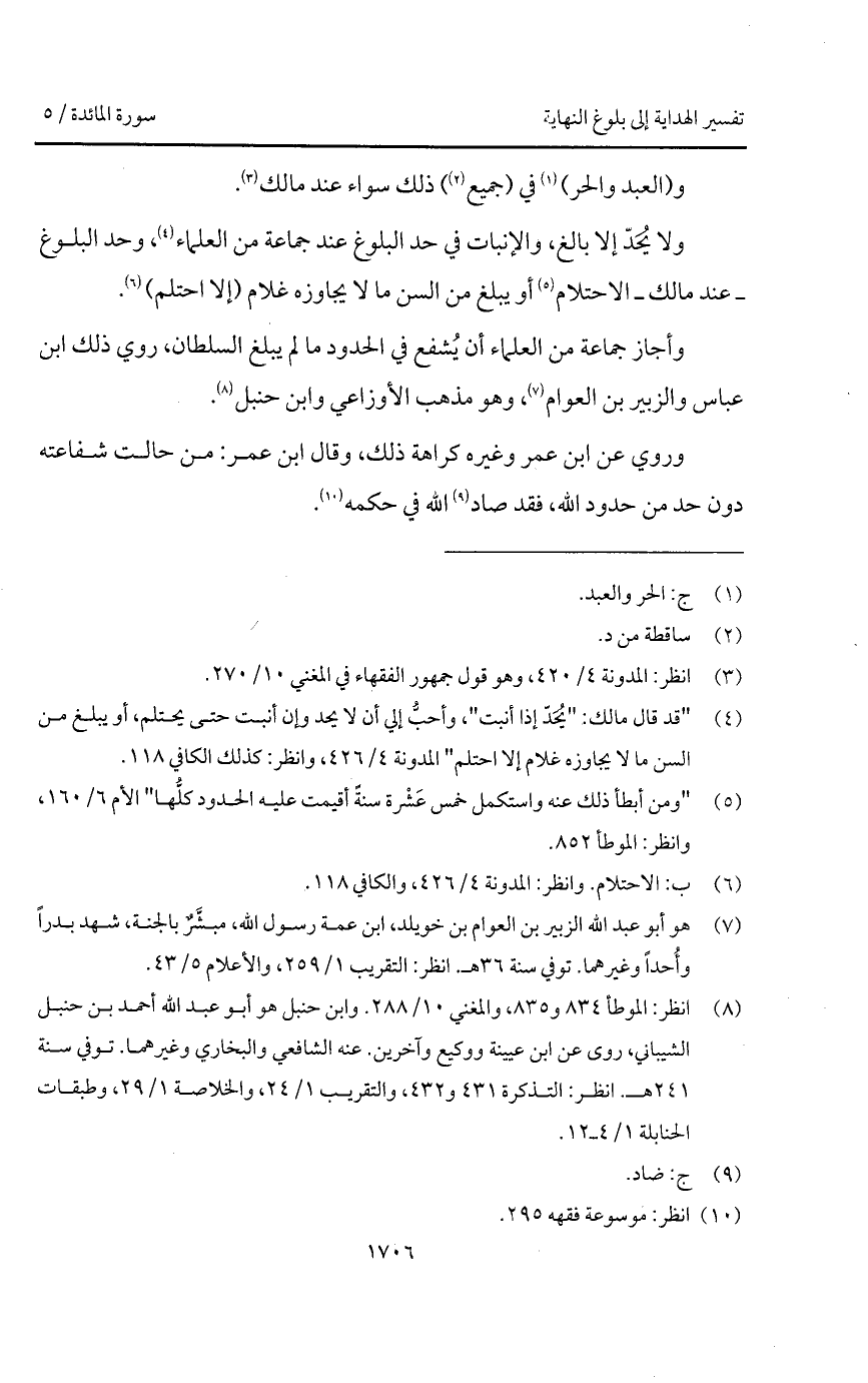 ولا يُحَدّ إلا بالغ، والإنبات في حد البلوغ عند جماعة من العلماء، وحد البلوغ - عند مالك - الاحتلام أو يبلغ من السن ما لا يجاوزه غلام (إلا احتلم).