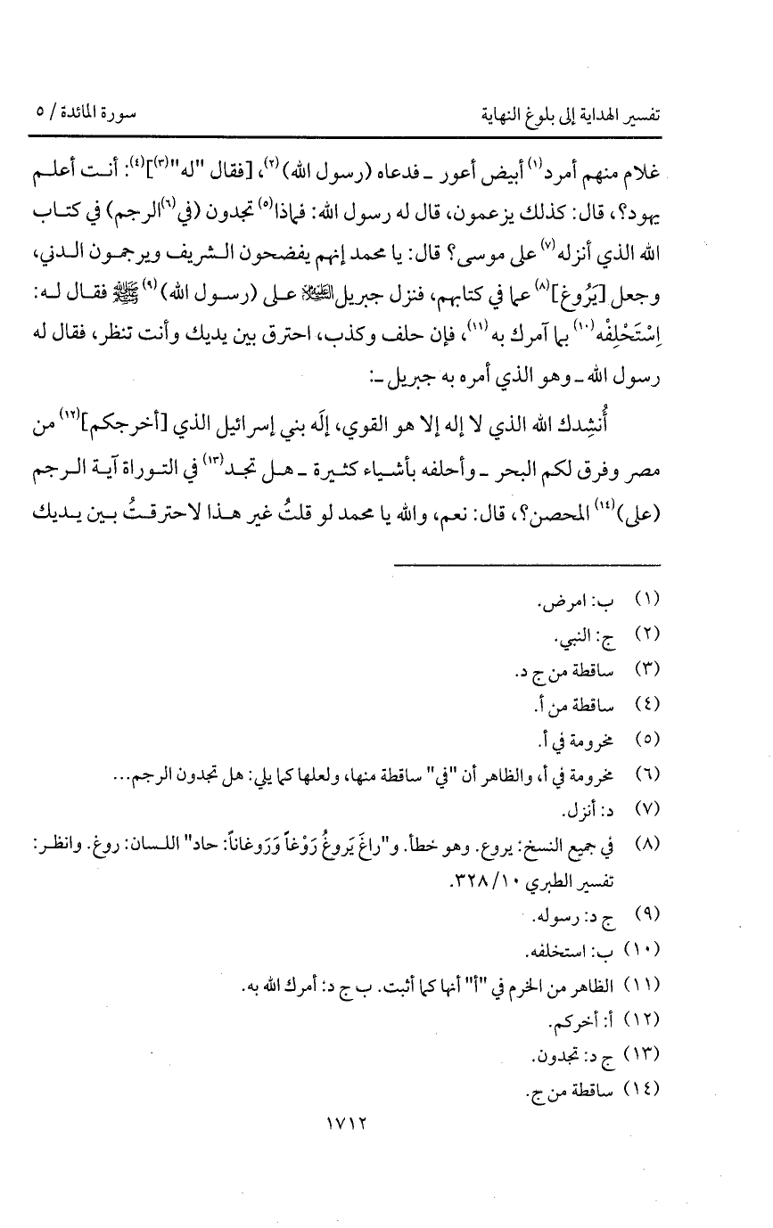 أُنشِدك الله الذي لا إله إلا هو القوي، إلَه بني إسرائيل الذي [أخرجكم] من مصر وفرق لكم البحر - وأحلفه بأشياء كثيرة - هل تجد في التوراة آية الرجم (على) المحصن؟، قال: نعم، والله يا محمد لو قلتُ غير هذا لاحترقتُ بين يديك