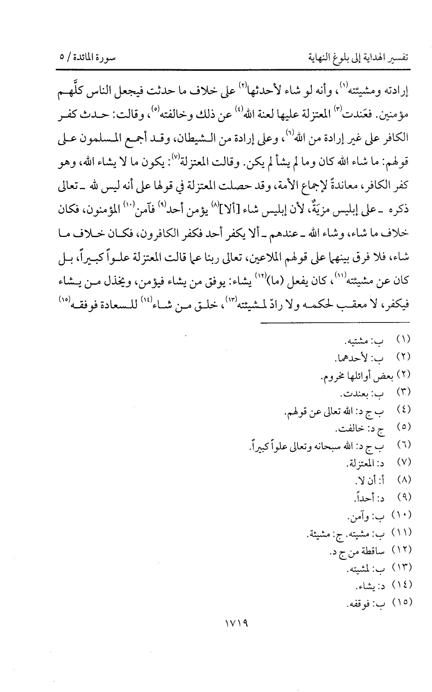 فعَندت المعتزلة عليها لعنة الله عن ذلك وخالفته، وقالت: حدث كفر الكافر على غير إرادة من الله، وعلى إرادة من الشيطان، وقد أجمع المسلمون على قولهم: ما شاء الله كان وما لم يشأ لم يكن. وقالت المعتزلة: يكون ما لا يشاء الله، وهو كفر الكافر، معاندةً لإجماع الأمة، وقد حصلت المعتزلة في قولها على أنه ليس لله - تعالى ذكره - على إبليس مزيَةٌ، لأن إبليس شاء [ألا] يؤمن أحد فآمن المؤمنون، فكان خلاف ما شاء، وشاء الله - عندهم - ألا يكفر أحد فكفر الكافرون، فكان خلاف ما شاء، فلا فرق بينهما على قولهم الملاعين، تعالى ربنا عما قالت المعتزلة علواً كبيراً، بل كان عن مشيئته، كان يفعل (ما) يشاء: يوفق من يشاء فيؤمن، ويخذل من يشاء فيكفر، لا معقب لحكمه ولا رادّ لمشيئته، وخلق من شاء للسعادة فوفقه