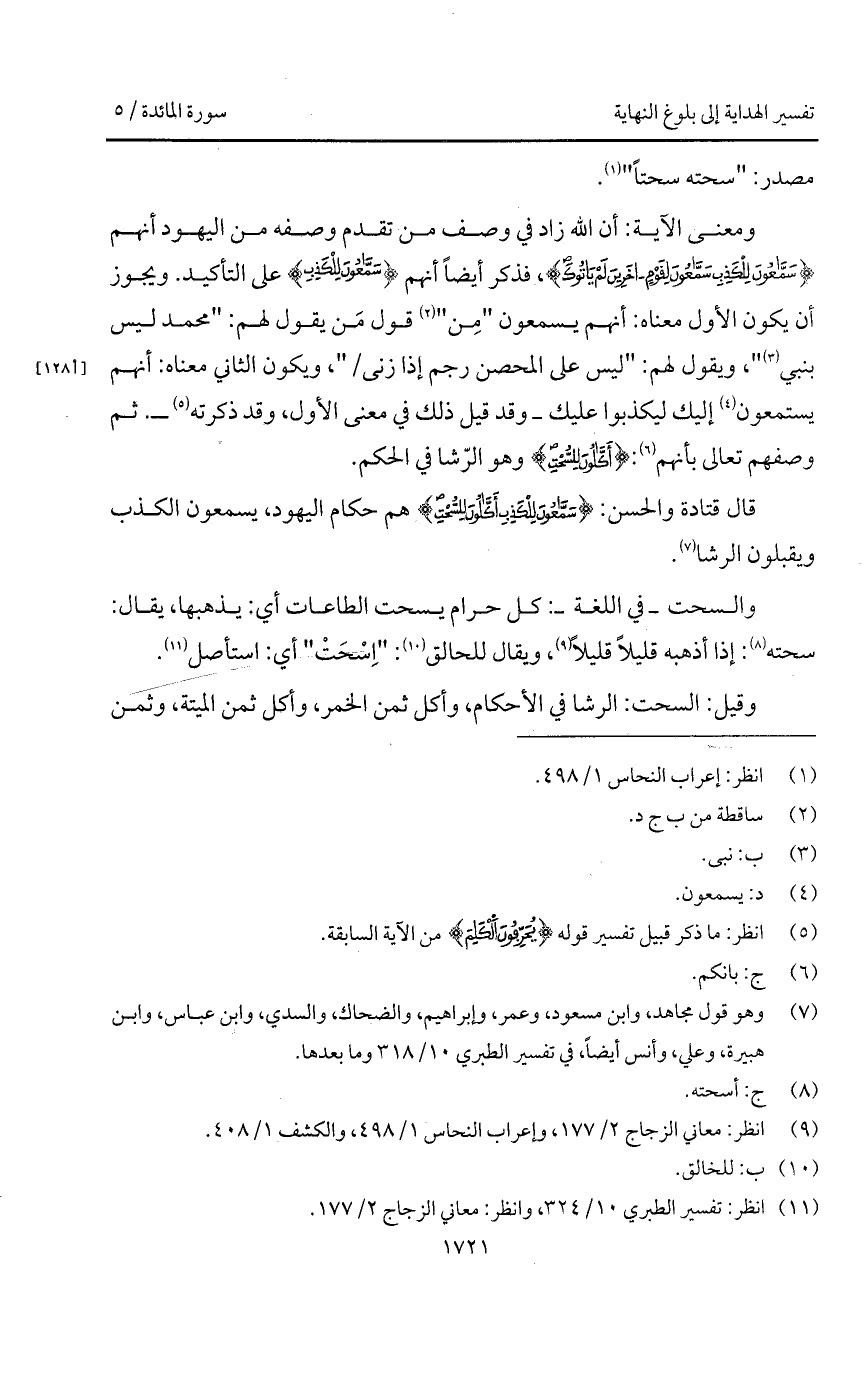 ومعنى الآية: أن الله زاد في وصف من تقدم وصفه من اليهود أنهم {سَمَّاعُونَ لِلْكَذِبِ سَمَّاعُونَ لِقَوْمٍ آخَرِينَ لَمْ يَأْتُوكَ}، فذكر أيضاً أنهم {سَمَّاعُونَ لِلْكَذِبِ} على التأكيد. ويجوز أن يكون الأول معناه: أنهم يسمعون " مِن " قول مَن يقول لهم: " محمد ليس بنبي "، ويقول لهم: " ليس على المحصن رجم إذا زنى / "، ويكون الثاني معناه: أنهم يستمعون إليك ليكذبوا عليك - وقد قيل ذلك في معنى الأول، وقد ذكرته -. ثم وصفهم تعالى بأنهم: {أَكَّالُونَ لِلسُّحْتِ} وهو الرّشا في الحكم.