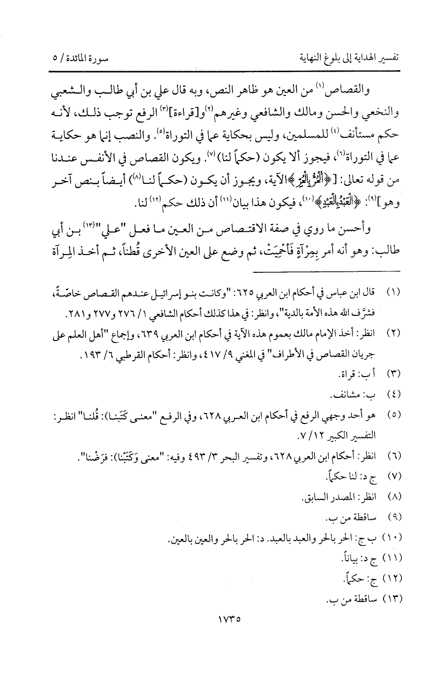 والقصاص من العين هو ظاهر النص، وبه علي بن أبي طالب والشعبي والنخعي والحسن ومالك والشافعي وغيرهم و [قراءة] الرفع توجب ذلك، لأنه حكم مستأنف للمسلمين، وليس بحكاية عما في التوراة. والنصب إنما هو حكاية عما في التوراة، فيجوز ألا يكون (حكماً لنا). ويكون القصاص في الأنفس عندنا من قوله تعالى: [{الحر بِالْحُرِّ} الآية، ويجوز أن يكون (حكماً لنا) أيضاً بنص آخر وهو]: {العبد بالعبد}، فيكون هذا بيان أن ذلك حكم لنا.