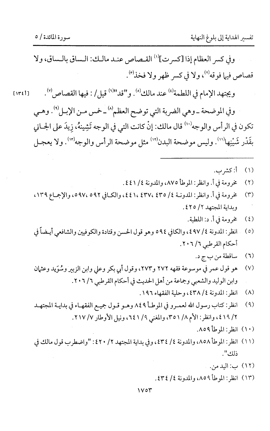 وفي الموضحة - وهي الضربة التي توضح العظم - خمس من الإبل. وهي تكون في الرأس والوجه قال مالك: إنْ كانت التي في الوجه تَشِينهُ، زِيدَ على الجاني بقَدْر شَيْنِها. وليس موضحة البدن مثل موضحة الرأس والوجه. ولا يعجل