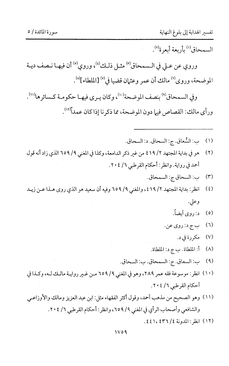 وفي السمحاق بنصف الموضحة، وكان يرى فيها حكومة كسائرها. ورأى مالك: القصاص فيما دون الموضحة، مما ذكرنا إذا كان عمداً.