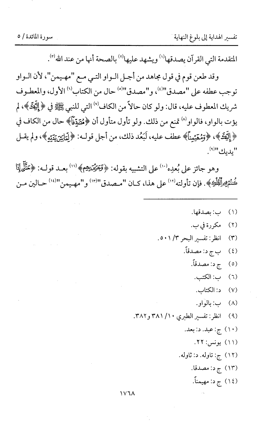 وقد طعن قوم في قول مجاهد من أجل الواو التي مع " مهيمن "، لأن الواو توجب عطفه على " مصدق "، و " مصدق " حال من الكتاب الأول، والمعطوف شريك المعطوف عليه، قال: ولو كان حالاً من الكاف التي للنبي A في {إِلَيْكَ}، لم يؤت بالواو، فالواو تمنع من ذلك. ولو تأول متأول أن {مُصَدِّقاً} حال من الكاف في {إِلَيْكَ}، {وَمُهَيْمِناً} عطف عليه، لَبَعُد ذلك، من أجل قوله: {لِّمَا بَيْنَ يَدَيْهِ}، ولم يقل " يديك ".