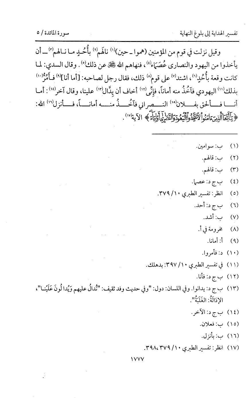 وقيل نزلت في قوم من المؤمنين (هموا - حين) نالَهم بأُحُدٍ ما نالهم - أن يأخذوا من اليهود والنصارى عُصَمَاء، فنهاهم الله D عن ذلك. وقال السدي: لما كانت وقعة بأُحُدٍ، اشتد على قوم ذلك، فقال رجل لصاحبه: [أما أنا] فأَمُرُّ بذلك اليهودي فآخُذُ منه أماناً، فإِنِّى أخاف أن يِدَّال علينا، وقال آخر: أما أنا فألحق بفلان النصراني فآخُذُ منه أماناً، فأنزل الله: {يا أيها الذين آمَنُواْ لاَ تَتَّخِذُواْ اليهود والنصارى أَوْلِيَآءَ} الآية.