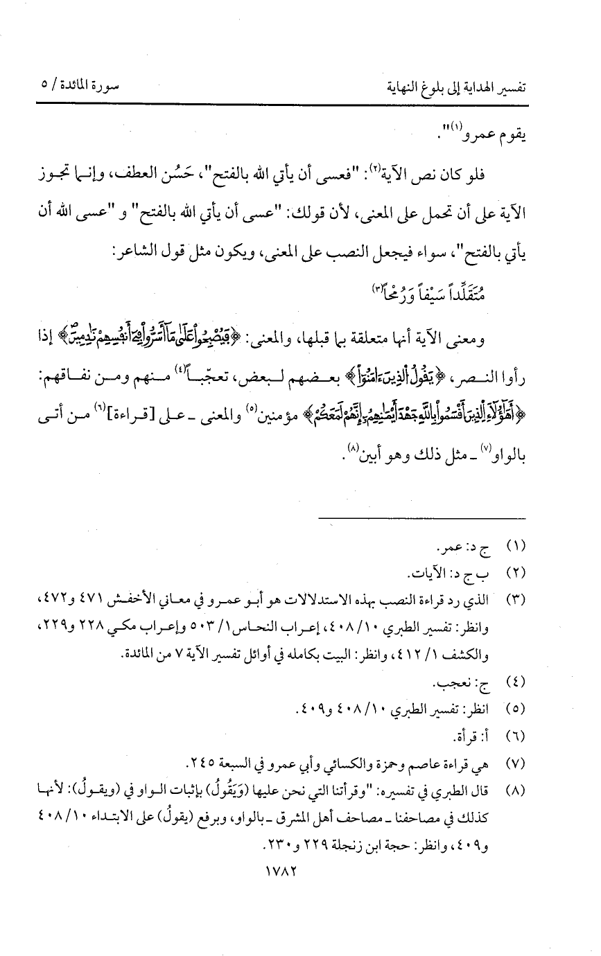 مُتَقَلِّداً سَيْفاً وَرُمْحاً ... ومعنى الآية أنها متعلقة بما قبلها، والمعنى: {فَيُصْبِحُواْ على مَآ أَسَرُّواْ في أَنْفُسِهِمْ نَادِمِينَ} إذا رأوا النصر، {يَقُولُ الذين آمَنُواْ} بعضهم لبعض، تعجّباً منهم ومن نفاقهم: {أهؤلاء الذين أَقْسَمُواْ بالله جَهْدَ أَيْمَانِهِمْ إِنَّهُمْ لَمَعَكُمْ} مؤمنين والمعنى - على [قراءة] من أتى بالواو - مثل ذلك وهو أبين.