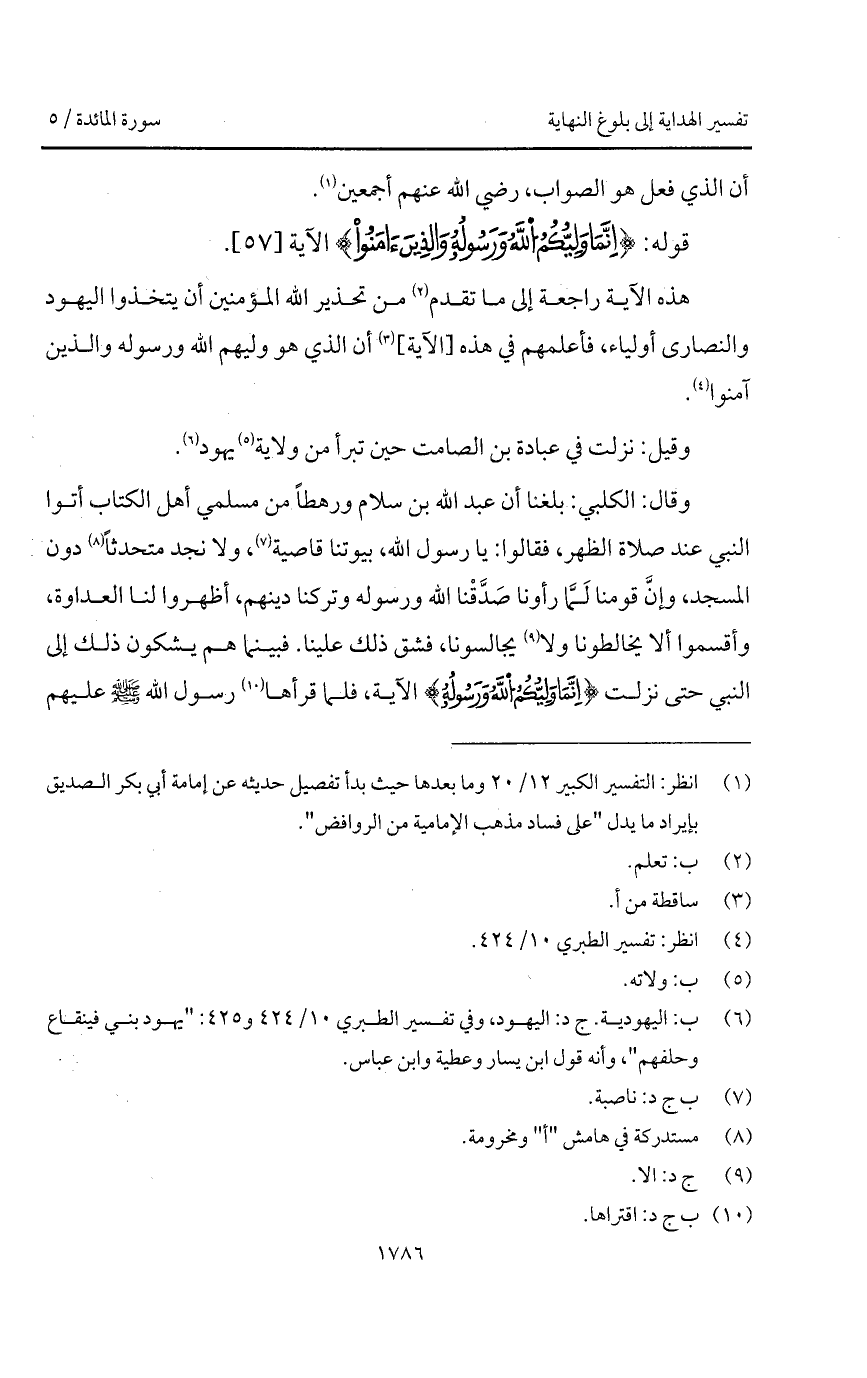 وقال: الكلبي: " بلغنا أن عبد الله بن سلام ورهطاً من مسلمي أهل الكتاب أتوا النبي عند صلاة الظهر، فقالوا: يا رسول الله، بيوتنا قاصية، ولا نجد متحدثاً دون المسجد، وإنَّ قومنا لَمَّا رأونا صَدَّقْنا الله ورسوله وتركنا دينهم، أظهروا لنا العداوة، وأقسموا ألا يخالطونا ولا يجالسونا، فشق ذلك علينا. فبينما هم يشكون ذلك إلى النبي حتى نزلت {إِنَّمَا وَلِيُّكُمُ الله وَرَسُولُهُ} الآية، فلما قرأها رسول الله A عليهم