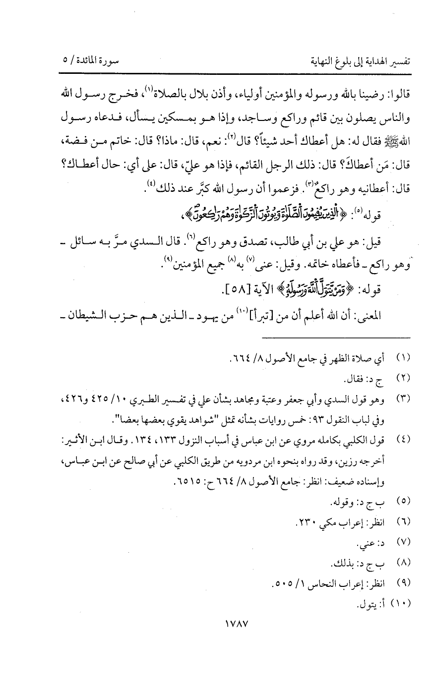 قالوا: رضينا بالله ورسوله والمؤمنين أولياء، وأذن بلال بالصلاة، فخرج رسول الله والناس يصلون بين قائم وراكع وساجد، وإذا هو بمسكين يسأل، فدعاه رسول الله A فقال له: هل أعطاك أحد شيئاً؟ قال: نعم، قال: ماذا؟ قال: خاتم من فضة، قال: مَن أعطاكَ؟ قال: ذلك الرجل القائم، فإذا هو عليّ، قال: على أي: حال أعطاك؟ قال: أعطانيه وهو راكعٌ. فزعموا أن رسول الله كبَّر عند ذلك ".