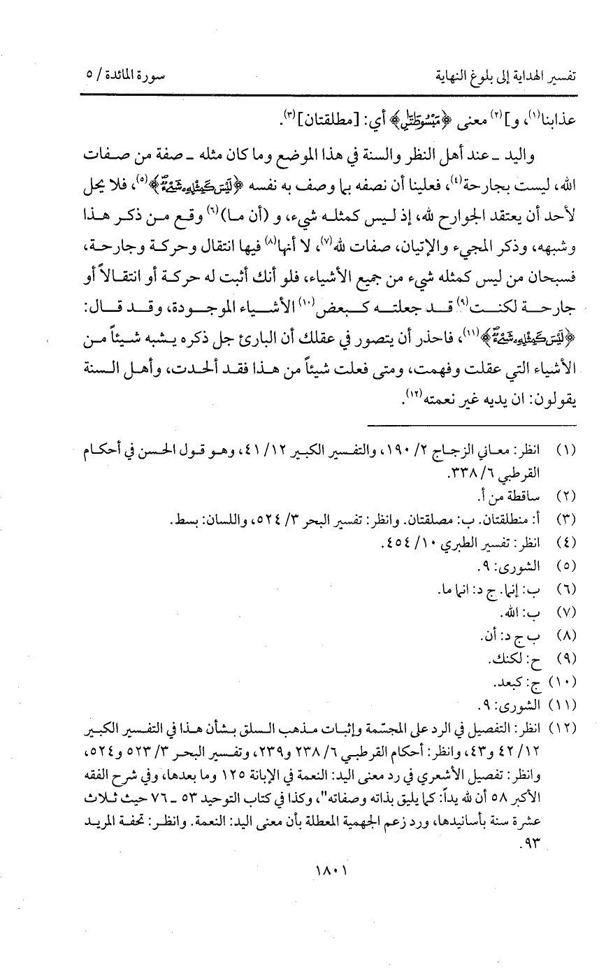 واليد - عند أهل النظر والسنة في هذا الموضع وما كان مثله - صفة من صفات الله، ليس بجارحة، فعلينا أن نصفه بما وصف به نفسه {لَيْسَ كَمِثْلِهِ شَيْءٌ} [الشورى: 11]، فلا يحل لأحد أن يعتقد الجوارح لله، إذ ليس كمثله شيء، و (أن ما) وقع من ذكر هذا وشبهه، وذكر المجيء والإتيان، صفات لله، لا أنها فيها انتقال وحركة وجارحة، فسبحان من ليس كمثله شيء من جميع الأشياء، فلو أنك أثبت له حركة أو انتقالاً أو جارحة لكنت قد جعلته كبعض الأشياء الموجودة، وقد قال: