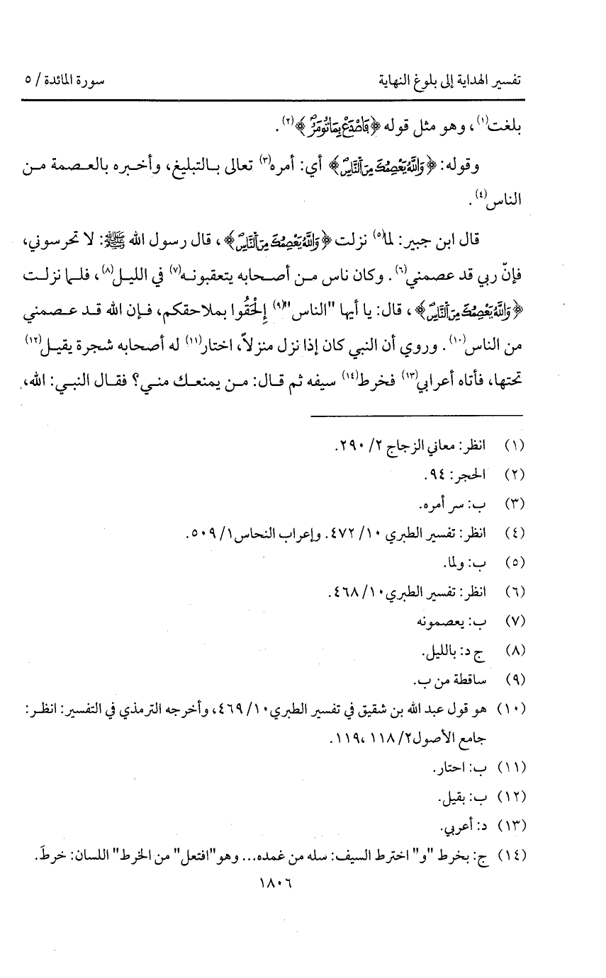 قال ابن جبير: " لما نزلت {والله يَعْصِمُكَ مِنَ الناس}، قال رسول الله A: لا تحرسوني، فإنّ ربي قد عصمني. وكان ناس من أصحابه يتعقبونه في الليل، فلما نزلت {والله يَعْصِمُكَ مِنَ الناس}، قال: يا أيها " الناس " إِلْحَقُوا بملاحقكم، فإن الله قد عصمني من الناس " وروي " أن النبي كان إذا نزل منزلاً، اختار له أصحابه شجرة يقيل تحتها، فأتاه أعرابي فخرط سيفه ثم قال: من يمنعك مني؟ فقال النبي: الله،