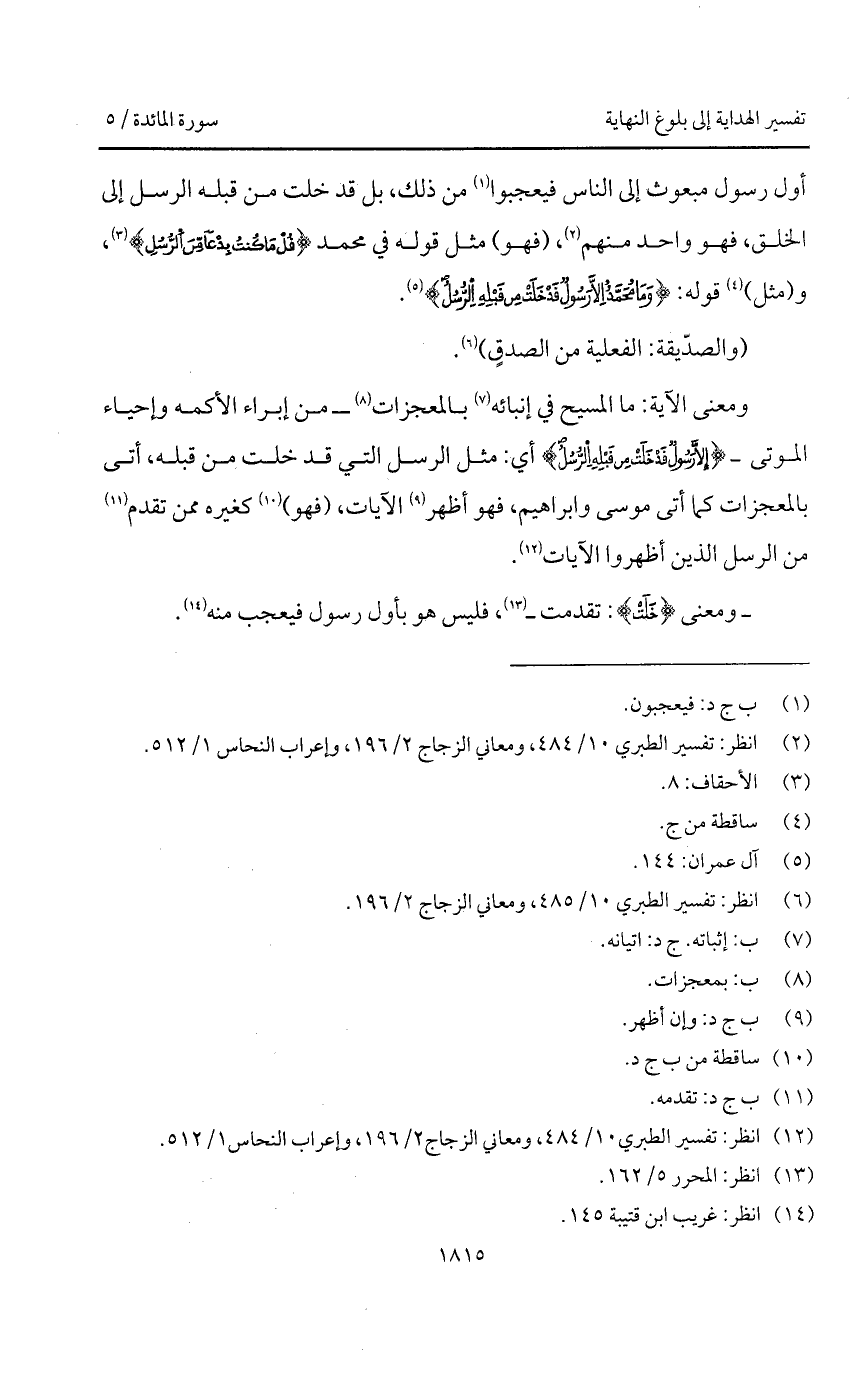 ومعنى الآية: ما المسيح في إنبائه بالمعجزات - من إبراء الأكمه وإحياء الموتى - {إِلاَّ رَسُولٌ قَدْ خَلَتْ مِن قَبْلِهِ الرسل} أي: مثل الرسل التي قد خلت من قبله، أتى بالمعجزات كما أتى موسى وابراهيم، فهو أظهر الآيات، (فهو) كغيره ممن تقدم من الرسل الذين أظهروا الآيات.
