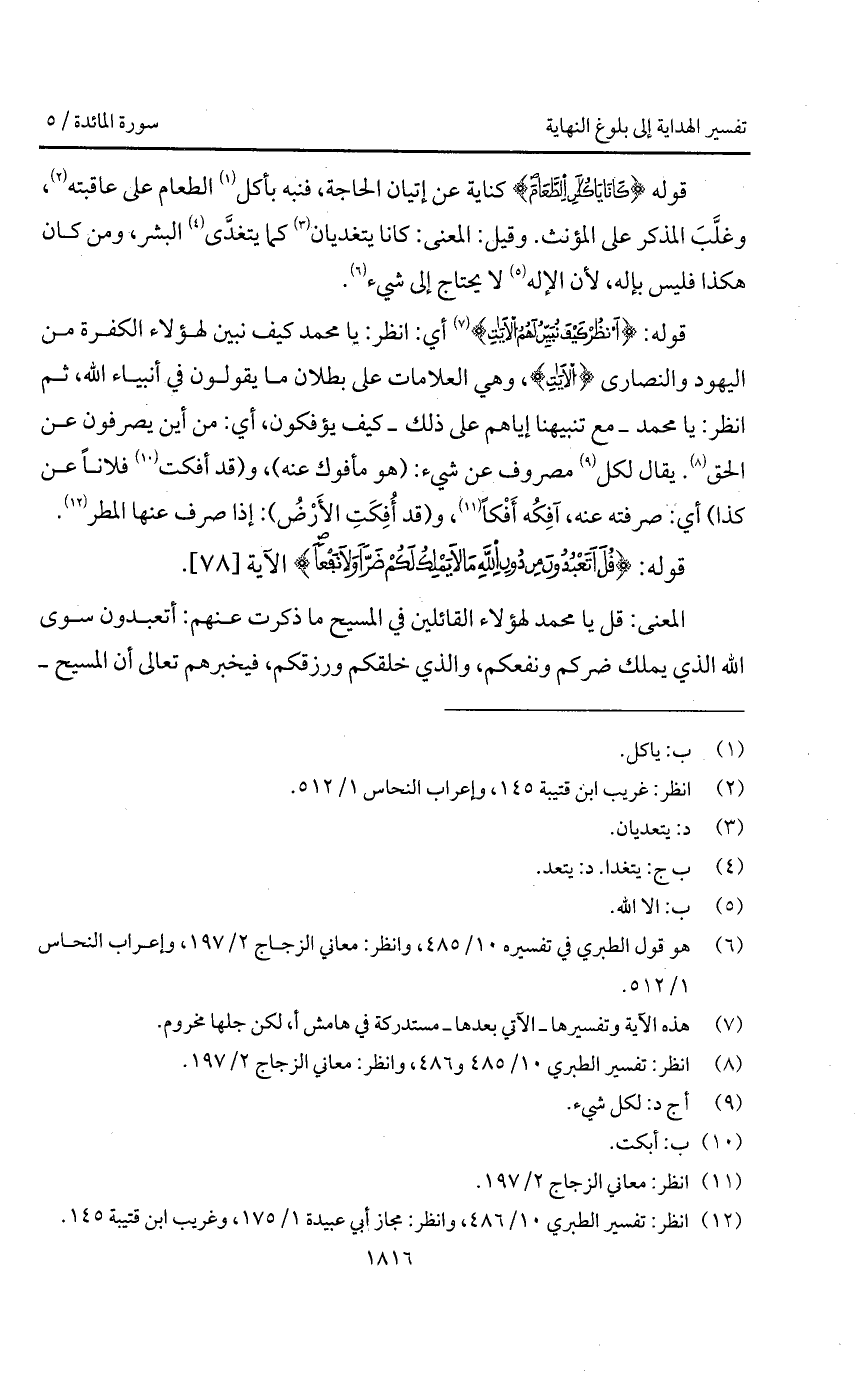 قوله: {انظر كَيْفَ نُبَيِّنُ لَهُمُ الآيات} أي: انظر يا محمد كيف نبين لهؤلاء الكفرة من اليهود والنصارى {الآيات}، وهي العلامات على بطلان ما يقولون في أنبياء الله، ثم انظر: يا محمد - مع تنبيهنا إياهم على ذلك - كيف يؤفكون، أي: من أين يصرفون عن الحق. يقال لكل مصروف عن شيء: (هو مأفوك عنه)، و (وقد أفكت فلاناً عن كذا) أي: صرفته عنه، آفِكُه أَفْكاً، و (قد أُفِكَتِ الأَرْضُ): إذا صرف عنها المطر.