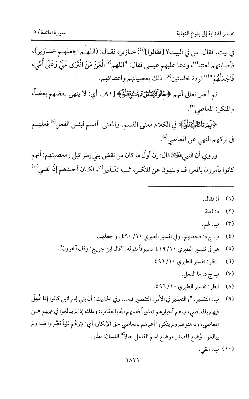 وروي أن النبي عليه السلام قال: " إن أولَ ما كان من نقض بني إسرائيل ومعصيتهم: أنهم كانوا يأمرون بالمعروف وينهون عن المنكر، شبه تعْذير، فكان أحدهم إذَا لقي