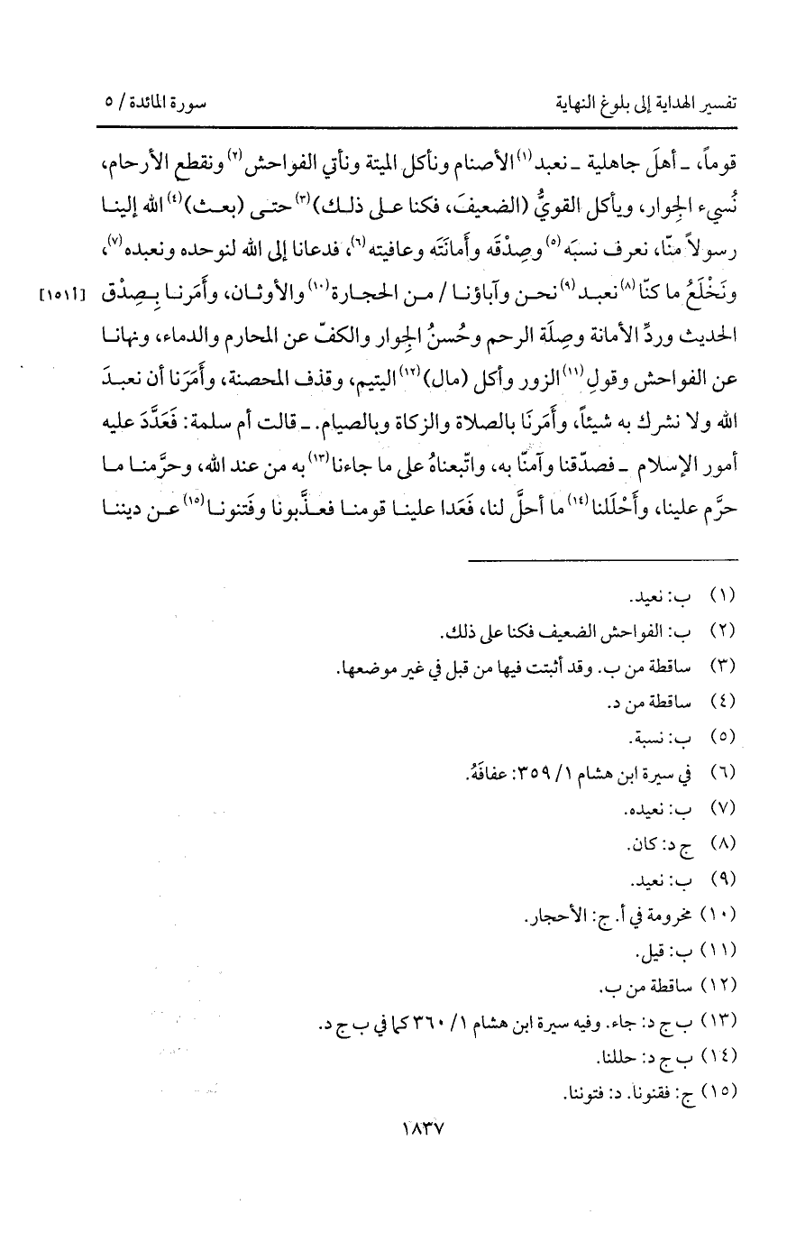 قوماً، - أهلَ جاهلية - نعبد الأصنام ونأكل الميتة ونأتي الفواحش ونقطع الأرحام، نُسيء الجِوار، ويأكل القويُّ (الضعيفَ، فكنا على ذلك) حتى (بعث) الله إلينا رسولاً منّا، نعرف نسبَه وصِدْقَه وأَمانَتَه وعافيته، فدعانا إلى الله لنوحده ونعبده، ونَخْلَعُ ما كنّا نعبد نحن وآباؤنا / من الحجارة والأوثان، وأَمَرنا بِصِدْق الحديث وردِّ الأمانة وصِلَة الرحم وحُسنُ الجِوار والكفّ عن المحارم والدماء، ونهانا عن الفواحش وقولِ الزور وأكل (مال) اليتيم، وقذف المحصنة، وأَمَرَنا أن نعبدَ الله ولا نشرك به شيئاً، وأَمَرنَا بالصلاة والزكاة وبالصيام. - قالت أم سلمة: فَعَدَّدَ عليه أمور الإسلام - فصدّقنا وآمنّا به، واتّبعناهُ على ما جاءنا به من عند الله، وحرَّمنا ما حرَّم علينا، وأَحْلَلنا ما أحلَّ لنا، فَعَدا علينا قومنا فعذَّبونا وفَتنونا عن ديننا