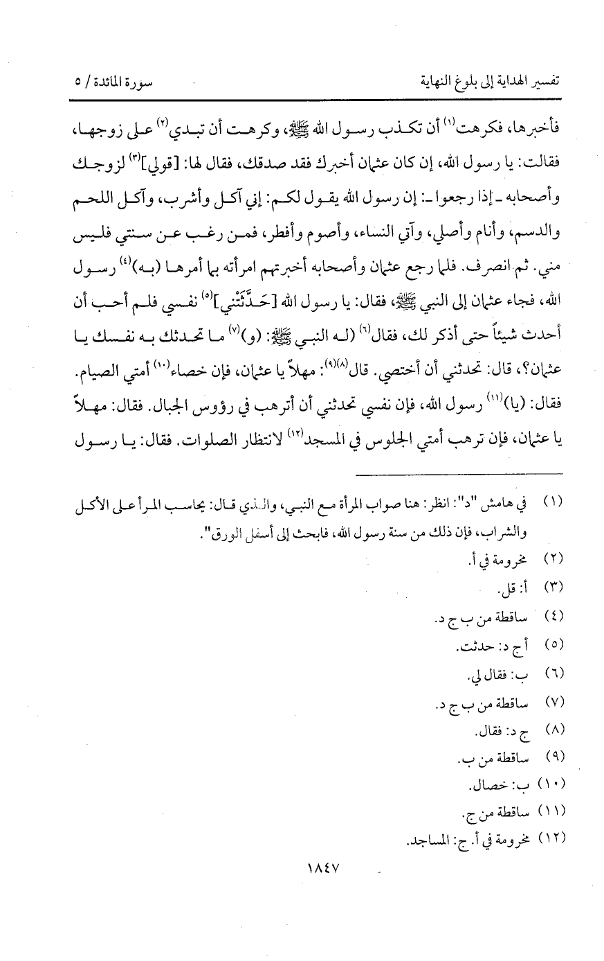 فأخبرها، فكرهت أن تكذب رسول الله A، وكرهت أن تبدي على زوجها، فقالت: يا رسول الله، إن كان عثمان أخبرك فقد صدقك، فقال لها: [قولي] لزوجك وأصحابه - إذا رجعوا -: إن رسول الله يقول لكم: إني آكل وأشرب، وآكل اللحم والدسم، وأنام وأصلي، وآتي النساء، وأصوم وأفطر، فمن رغب عن سنتي فليس مني. ثم انصرف. فلما رجع عثمان وأصحابه أخبرتهم امرأته بما أمرها (به) رسول الله، فجاء عثمان إلى النبي A، فقال: يا رسول الله [حَدَّثَتْني] نفسي فلم أحب أن أحدث شيئاً حتى أذكر لك، فقال (له النبي A: ( و) ما تحدثك به نفسك يا عثمان؟، قال: تحدثني أن أختصي. قال: مهلاً يا عثمان، فإن خصاء أمتي الصيام. فقال: (يا) رسول الله، فإن نفسي تحدثني أن أترهب في رؤوس الجبال. فقال: مهلاً يا عثمان، فإن ترهب أمتي الجلوس في المسجد لانتظار الصلوات. فقال: يا رسول