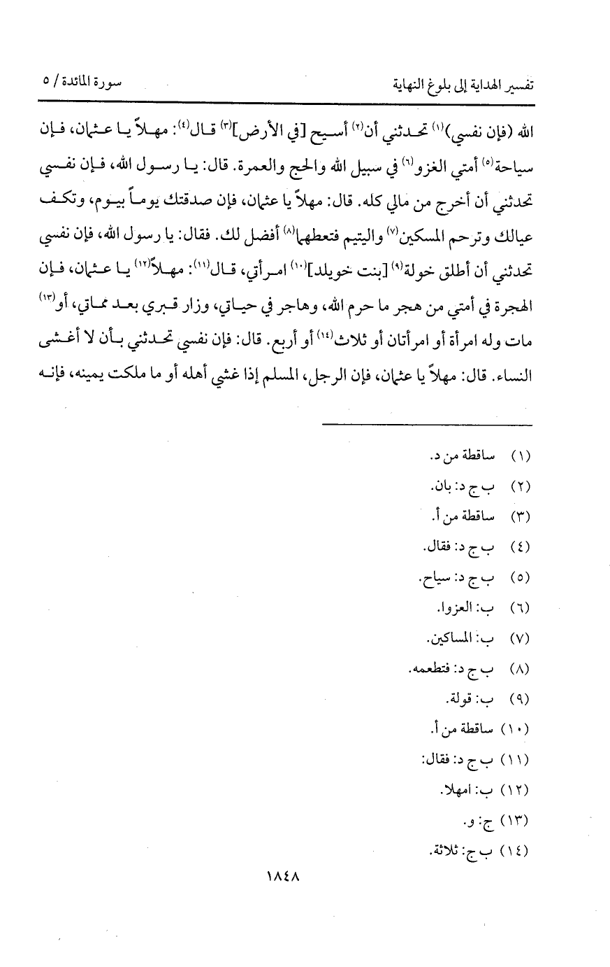 الله (فإن نفسي) تحدثني أن أسيح [في الأرض] قال: مهلاً يا عثمان، فإن سياحة أمتي الغزو في سبيل الله والحج والعمرة. قال: يا رسول الله، فإن نفسي تحدثني أن أخرج من مالي كله. قال: مهلاً يا عثمان، فإن صدقتك يوماً بيوم، وتكف عيالك وترحم المسكين واليتيم فتعطهما أفضل لك. فقال: يا رسول الله، فإن نفسي تحدثني أن أطلق خولة [بنت خويلد] امرأتي، قال: مهلاً يا عثمان، فإن الهجرة في أمتي من هجر ما حرم الله، وهاجر في حياتي، وزار قبري بعد مماتي، أو مات وله امرأة أو امرأتان أو ثلاث أو أربع. قال: فإن نفسي تحدثني بأن لا أغشى النساء. قال: مهلاً يا عثمان، فإن الرجل، المسلم إذا غشي أهله أو ما ملكت يمينه، فإنه