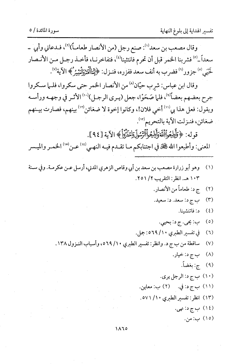 وقال مصعب بن سعد: صنع رجل (من الأنصار طعاماً)، فدعاني وأبي - سعداً - فشربنا الخمر قبل أن تحرم فانتثينا. فتفاخرنا، فأخذ رجل من الأنصار لَحْيَي جزور فضرب به أنف سعد ففزره، فنزل: {إِنَّمَا الخمر والميسر} الآية.