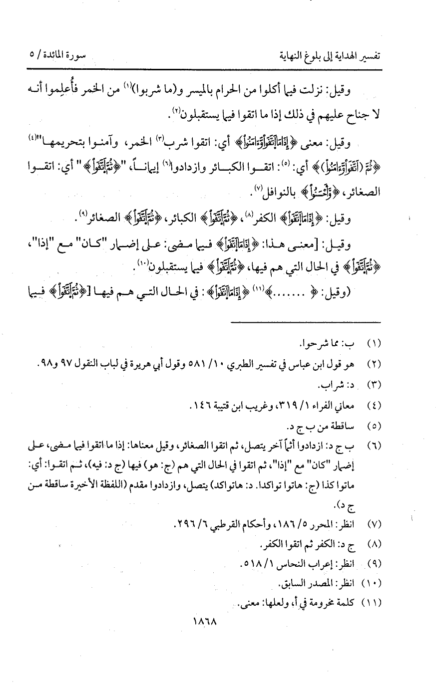 وقيل: معنى {إِذَا مَا اتقوا وَآمَنُواْ} أي: اتقوا شرب الخمر، وآمنوا بتحريمها " {ثُمَّ (اتَّقَواْ وَآمَنُواْ)} أي: اتقوا الكبائر وازدادوا إيماناً، " {ثُمَّ اتَّقَواْ} " أي: اتقوا الصغائر، {وَّأَحْسَنُواْ} بالنوافل.