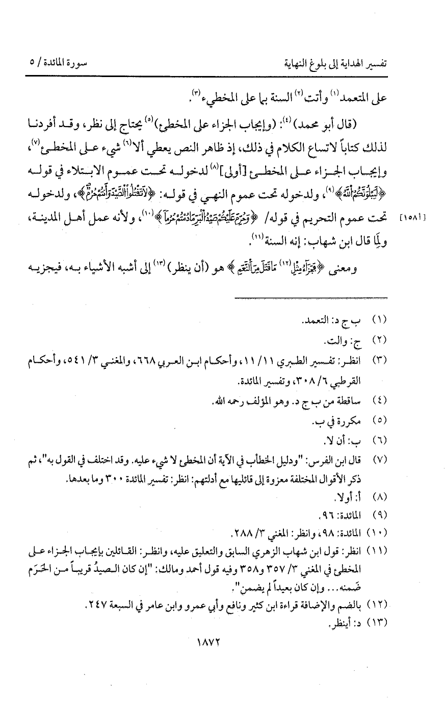 (قال أبو محمد): (وإيجاب الجزاء على المخطئ) يحتاج إلى نظر، وقد أفردنا لذلك كتاباً لاتساع الكلام في ذلك، إذ ظاهر النص يعطي ألا شيء على المخطئ، وإيجاب الجزاء على المخطئ [أولى] لدخوله تحت عموم الابتلاء في قوله {لَيَبْلُوَنَّكُمُ الله} [المائدة: 94]، ولدخوله تحت عموم النهي في قوله: {لاَ تَقْتُلُواْ الصيد وَأَنْتُمْ حُرُمٌ}، ولدخوله تحت عموم التحريم في قوله / {وَحُرِّمَ عَلَيْكُمْ صَيْدُ البر مَا دُمْتُمْ حُرُماً} [المائدة: 96]، ولأنه عمل أهل المدينة، ولِمَا قال ابن شهاب: إنه السنة.