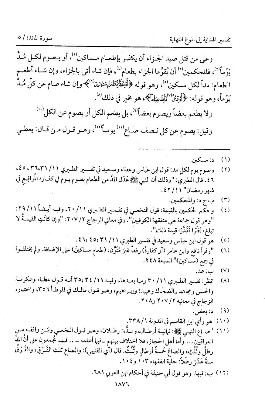 وعلى من قتل صيد الجزاء أن يكفر بإطعام مساكين، أو يصوم لكل مُدٍّ يَوْماً، فللحكمين أن يُقوِّما الجزاء بطعام، فإن شاء أتى بالجزاء، وإن شاء أطعم الطعام: مداً لكل مسكين، وهو قوله {أَوْ كَفَّارَةٌ طَعَامُ مَسَاكِينَ} وإن شاء صام عن كلّ مُدٍّ يَوْماً، وهو قوله: {أَو عَدْلُ ذلك صِيَاماً}، هو مخير في ذلك.