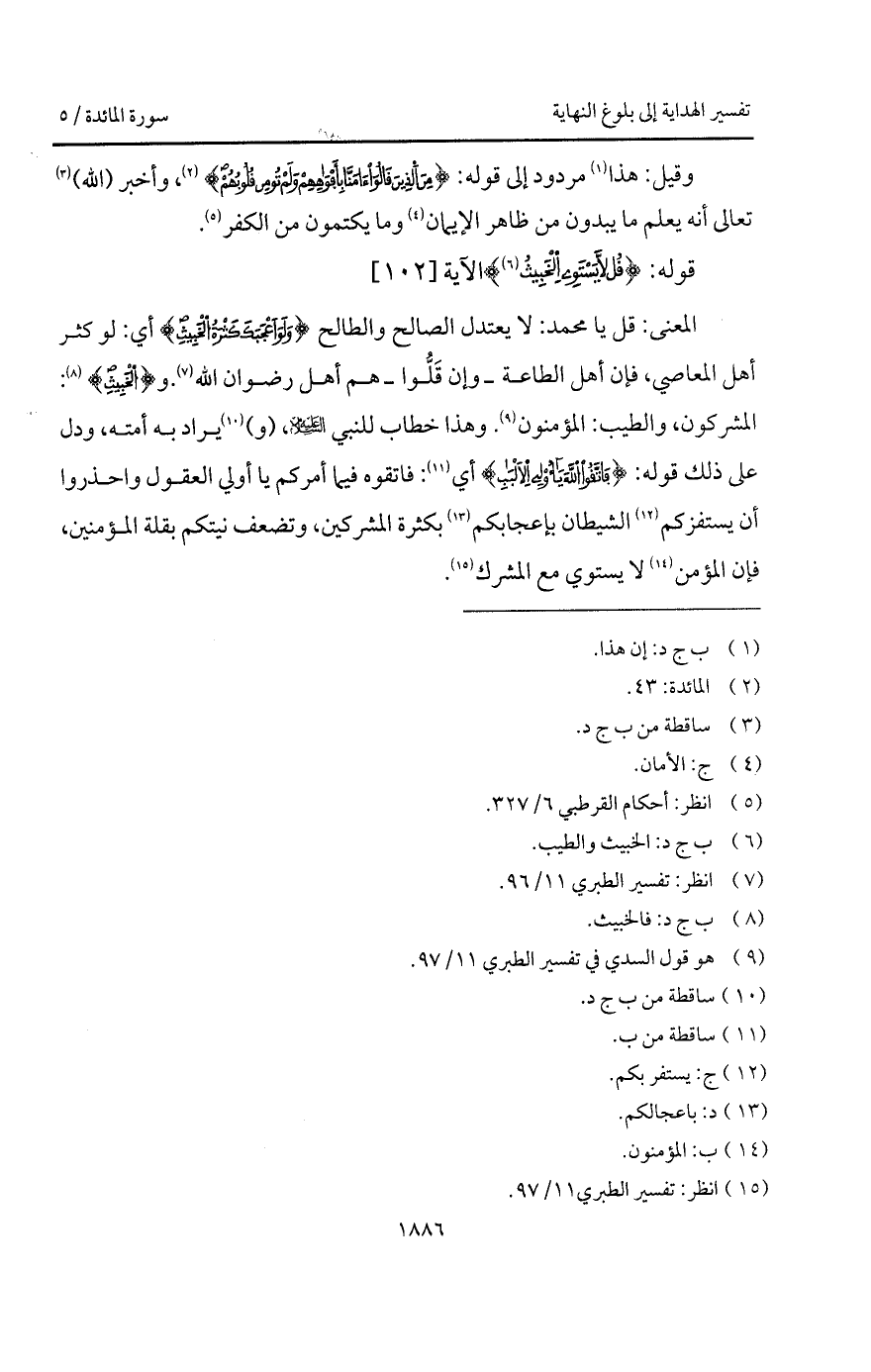 المعنى: قل يا محمد: لا يعتدل الصالح والطالح {وَلَوْ أَعْجَبَكَ كَثْرَةُ الخبيث} أي: لو كثر أهل المعاصي، فإن أهل الطاعة - وإن قَلُّوا - هم أهل رضوان الله. و {الخبيث}: المشركون، والطيب: المؤمنون. وهذا خطاب للنبي عليه السلام، (و) يراد به أمته، ودل على ذلك قوله: {فاتقوا الله يا أولي الألباب} أي: فاتقوه فيما أمركم يا أولي العقول واحذروا أن يستفزكم الشيطان بإعجابكم بكثرة المشركين، وتضعف نيتكم بقلة المؤمنين، فإن المؤمن لا يستوي مع المشرك.