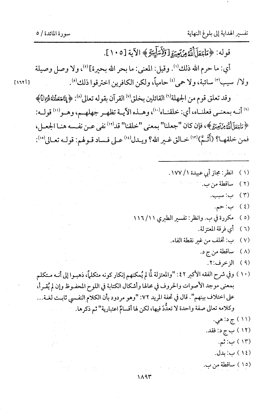 وقد تعلق قوم من الجهلة القائلين بخلق القرآن بقوله تعالى: {إِنَّا جَعَلْنَاهُ قُرْآناً} [الزخرف: 3] أنه بمعنى فعلناه، أي: خلقناه، وهذه الآية تظهر جهلهم، وهو قوله: {مَا جَعَلَ الله مِن بَحِيرَةٍ}، فإن كان " جعلنا " بمعنى " خلقنا " قد نفى عن نفسه هنا الجعل، فمن خلقها؟ (أَثَمَّ) خالق غير الله؟ ويدل على فساد قولهم: قوله تعالى:
