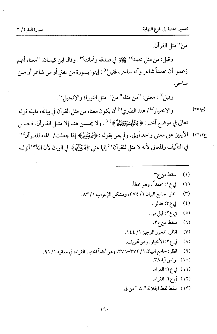 والاختيار / عند الطبري أن يكون معناه من مثل القرآن في بيانه، دليله قوله تعالى في موضع آخر: {فَأْتُواْ بِسُورَةٍ مِّثْلِهِ} [يونس: 38]. ولا يحسن هنا إلا مثل القرآن. فحمل الآيتين على معنى واحد أولى. ولم يعن بقوله: {مِّن مِّثْلِهِ} إذا جعلت / الهاء للقرآن في التأليف والمعاني لأنه لا مثل للقرآن إنما عني {مِّن مِّثْلِهِ} في البيان لأن الله أنزله