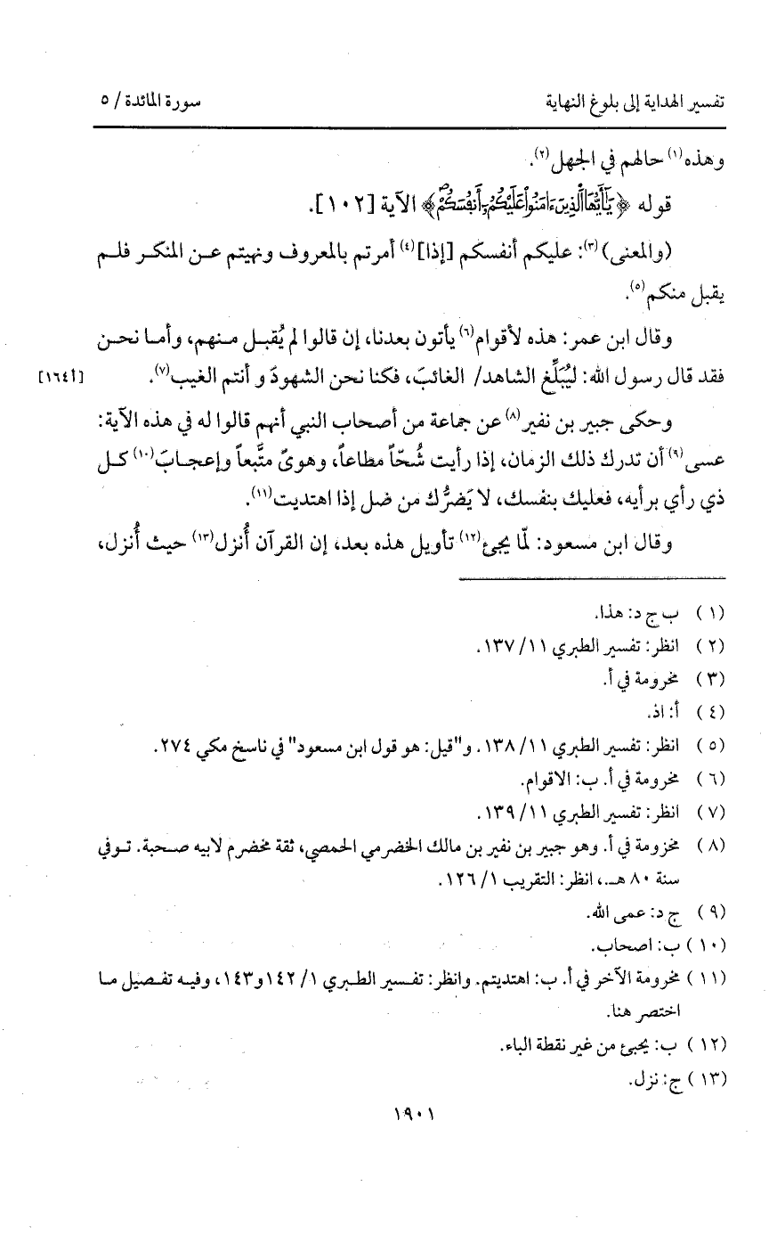 وحكى جبير بن نفير عن جماعة من أصحاب النبي أنهم قالوا له في هذه الآية: عسى أن تدرك ذلك الزمان، إذا رأيت شُحّاً مطاعاً، وهوىً متَّبعاً وإعجابَ كل ذي رأي برأيه، فعليك بنفسك، لا يَضرُّك من ضل إذا اهتديت.