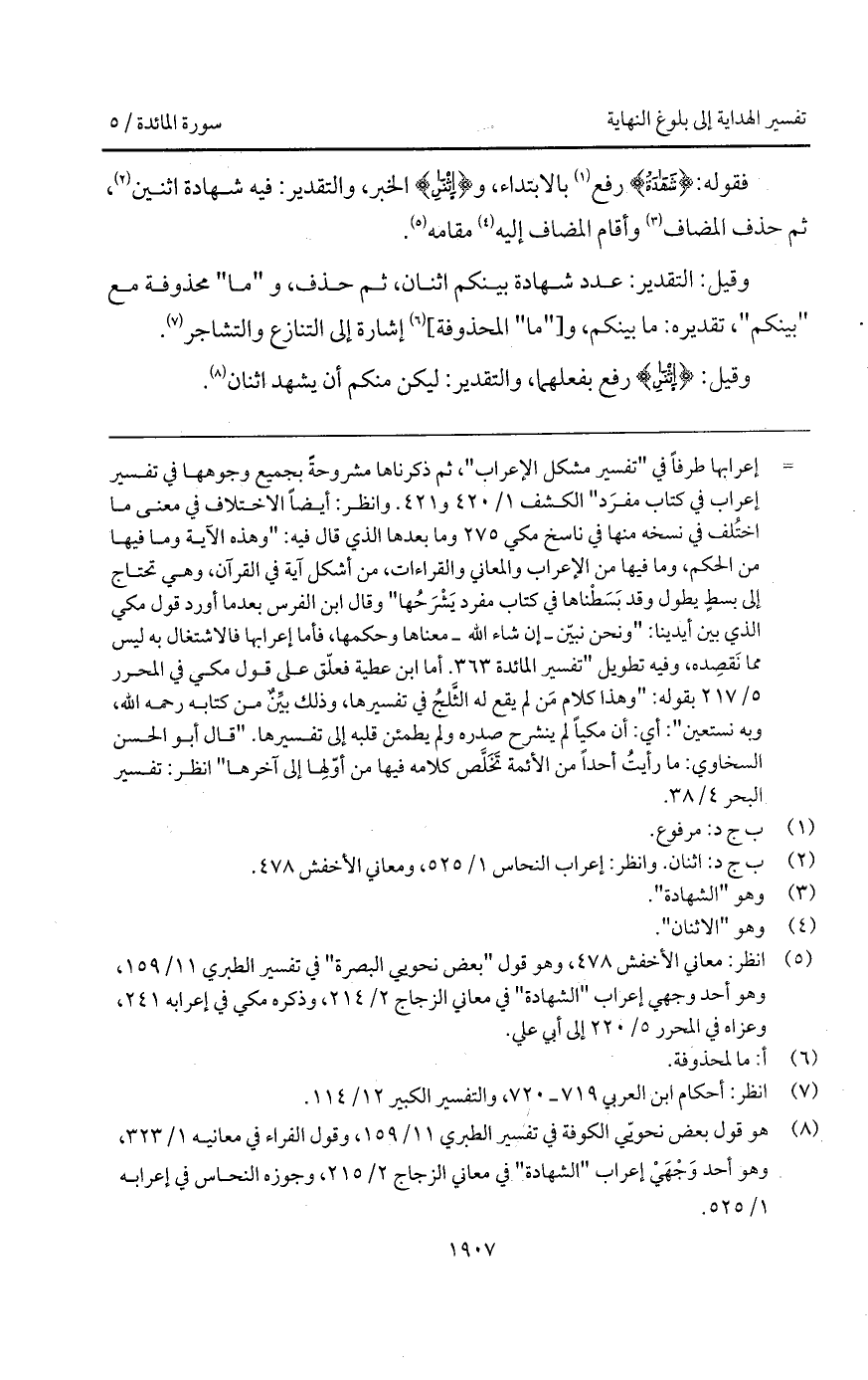وقيل: التقدير: عدد شهادة بينكم اثنان، ثم حذف، و " ما " محذوفة مع " بينكم "، تقديره: ما بينكم، و [" ما " المحذوفة] إشارة إلى التنازع والتشاجر.