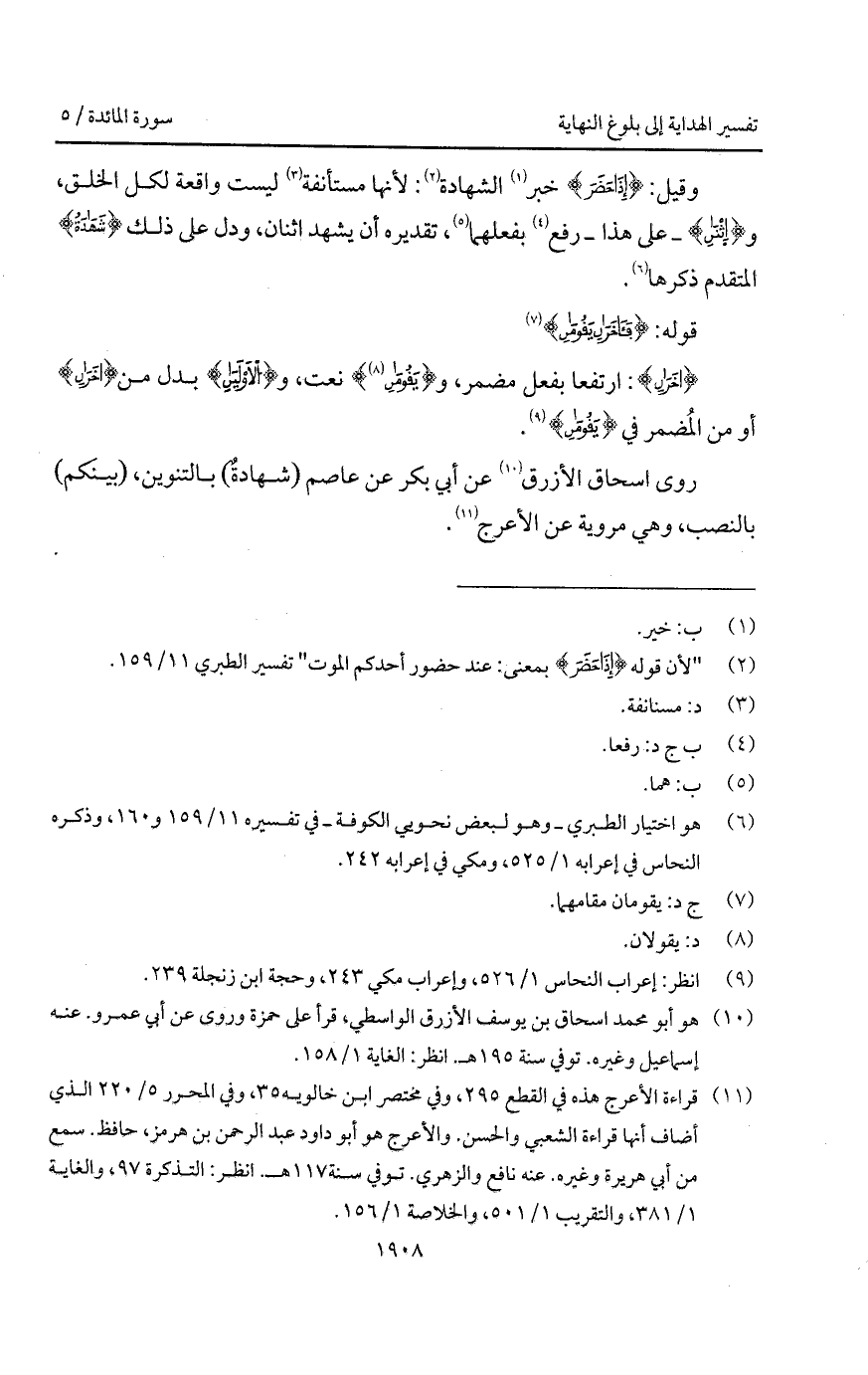 روى اسحاق الأزرق عن أبي بكر عن عاصم (شهادةٌ) بالتنوين، (بينكم) بالنصب، وهي مروية عن الأعرج.