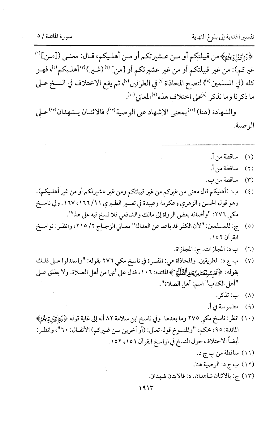 {ذَوَا عَدْلٍ مِّنْكُمْ} من قبيلتكم أو من عشيرتكم أو من أهليكم، قال: معنى: ([من] غيركم): من غير قبيلتكم أو من غير عشيرتكم أو [من] (غير) أهليكم، فهو كله (في المسلمين) لتصح المحاذاة في الطرفين، ثم يقع الاختلاف في النسخ على ما ذكرنا وما نذكر على اختلاف هذه المعاني.