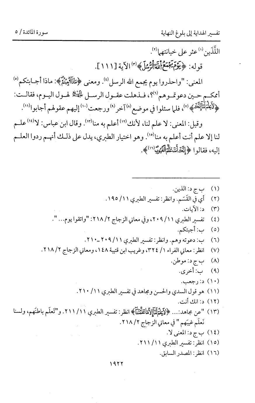 المعنى: " واحذروا يوم يجمع الله الرسل. ومعنى {مَاذَآ أُجِبْتُمْ}: ما أجابتكم أممكم حين دعوتموهم؟، فذهلت عقول الرسل عليهم السلام لهول اليوم، فقالت: {لاَ عِلْمَ لَنَآ إِنَّكَ}، فلما سئلوا في موضع آخر ورجعت إليهم عقولهم أجابوا.