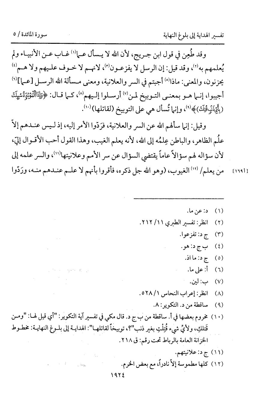 وقيل: إنما سألهم الله عن السر والعلانية، فرَدّوا الأمر إليه، إذ ليس عندهم إلاّ علمُ الظاهر، والباطن عِلمُه إلى الله، لأنه يعلم الغيب، وهذا القول أحب الأقوال إليّ، لأن سؤاله لهم سؤالاً عاماً يقتضي السؤال عن سر الأمم وعلانيتها، والسر علمه إلى من يعلم / الغيوب، (وهو الله جل ذكره، فأقروا بأنهم لا علم عندهم منه، ورَدّوا