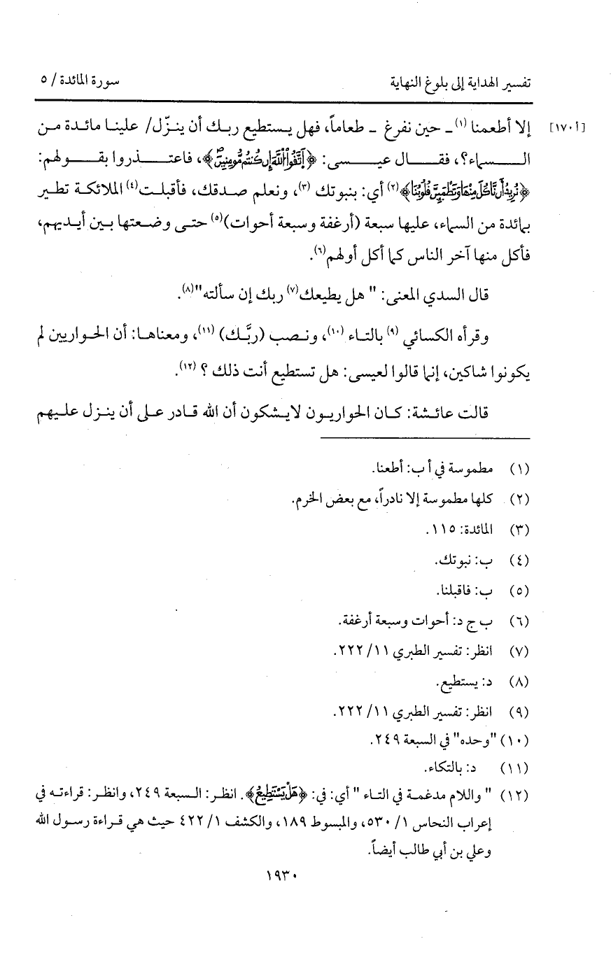إلا أطعمنا - حين فرغ - طعاماً، فهل يستطيع ربك أن ينزّل / علينا مائدة من السماء؟ فقال عيسى: {اتقوا الله إِن كُنْتُم مُّؤْمِنِينَ}، فاعتذروا بقولهم: {نُرِيدُ أَن نَّأْكُلَ مِنْهَا وَتَطْمَئِنَّ قُلُوبُنَا} أي: بنبوتك، ونعلم صدقك، فأقبلت الملائكة تطير بمائدة من السماء، عليها سبعة (أرغفة وسبعة أحوات) حتى وضعتها بين أيديهم، فأكل منها آخر الناس كما أكل أولهم.