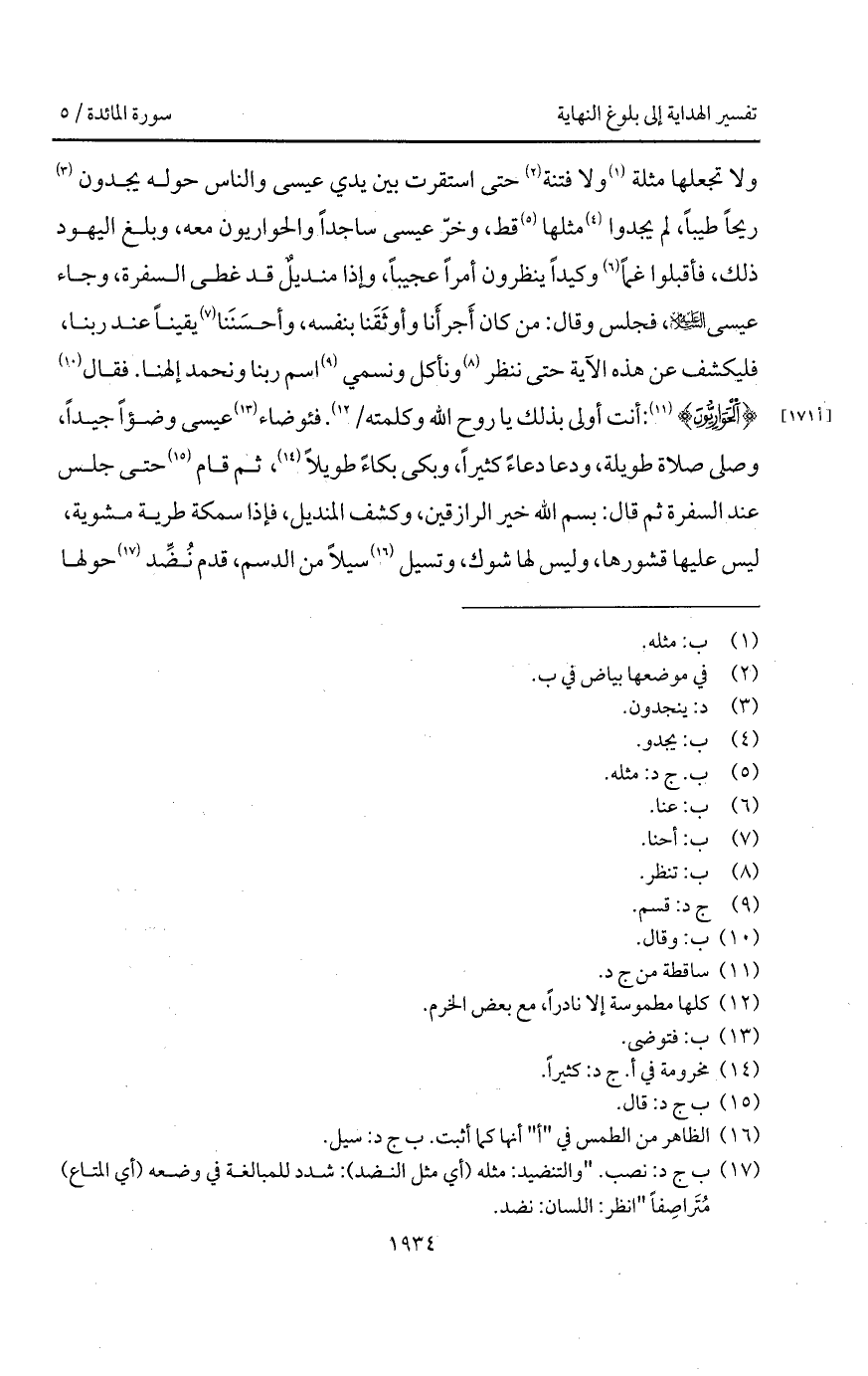 ولا تجعلها مثلة ولا فتنة حتى استقرت بين يدي عيسى والناس حوله يجدون ريحاً طيباً، لم يجدوا مثلها قط، وخرّ عيسى ساجداً والحواريون معه، وبلغ اليهود ذلك، فأقبلوا غماً وكيداً ينظرون أمراً عجيباً، وإذا منديلٌ قد غطى السفرة، وجاء عيسى عليه السلام، فجلس وقال: من كان أَجرأَنا وأَوثَقَنا بنفسه، وأحسَنَنا يقيناً عند ربنا، فليكشف عن هذه الآية حتى ننظر ونأكل ونسمي اسم ربنا ونحمد إلهنا. فقال {الحواريون}: أنت أولى بذلك يا روح الله وكلمته /. فئوضاء عيسى وضؤاً جيداً، وصلى صلاة طويلة، ودعا دعاءً كثيراً، وبكى بكاءً طويلاً، ثم قام حتى جلس عند السفرة ثم قال: بسم الله خير الرازقين، وكشف المنديل، فإذا سمكة طرية مشوية، ليس عليها قشورها، وليس لها شوك، وتسيل سيلاً من الدسم، قدم نُضِّد حولها