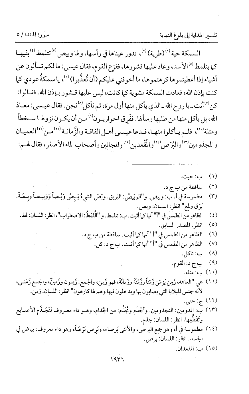 السمكة حية (طرية)، تدور عيناها في رأسها، ولها وبيص تتلمط بفيها كما يتلمط الأسد، وعاد عليها قشورها، ففزع القوم، فقال عيسى: ما لكم تسألون عن أشياء إذا أعطيتموها كرهتموها، ما أخوفني عليكم (أن تُعذَّبوا)، يا سمكةُ عودي كما كنت بإذن الله، فعادت السمكة مشوية كما كانت، ليس عليها قشور بإذن الله. فقالوا: كن أنت - يا روح الله - الذي يأكل منها أول مرة، ثم نأكل نحن. فقال عيسى: معاذ الله، بل يأكل منها من طلبها وسألها، ففَرِق الحواريون من أن يكون نزولها سخطاً ومثلة، فلم يأكلوا منها، فدعا عيسى أهل الفاقة والزَّمانة من العميان والمجذومين والبُرْص والمُقْعدين والمجانين وأصحاب الماء الأصفر، فقال لهم:
