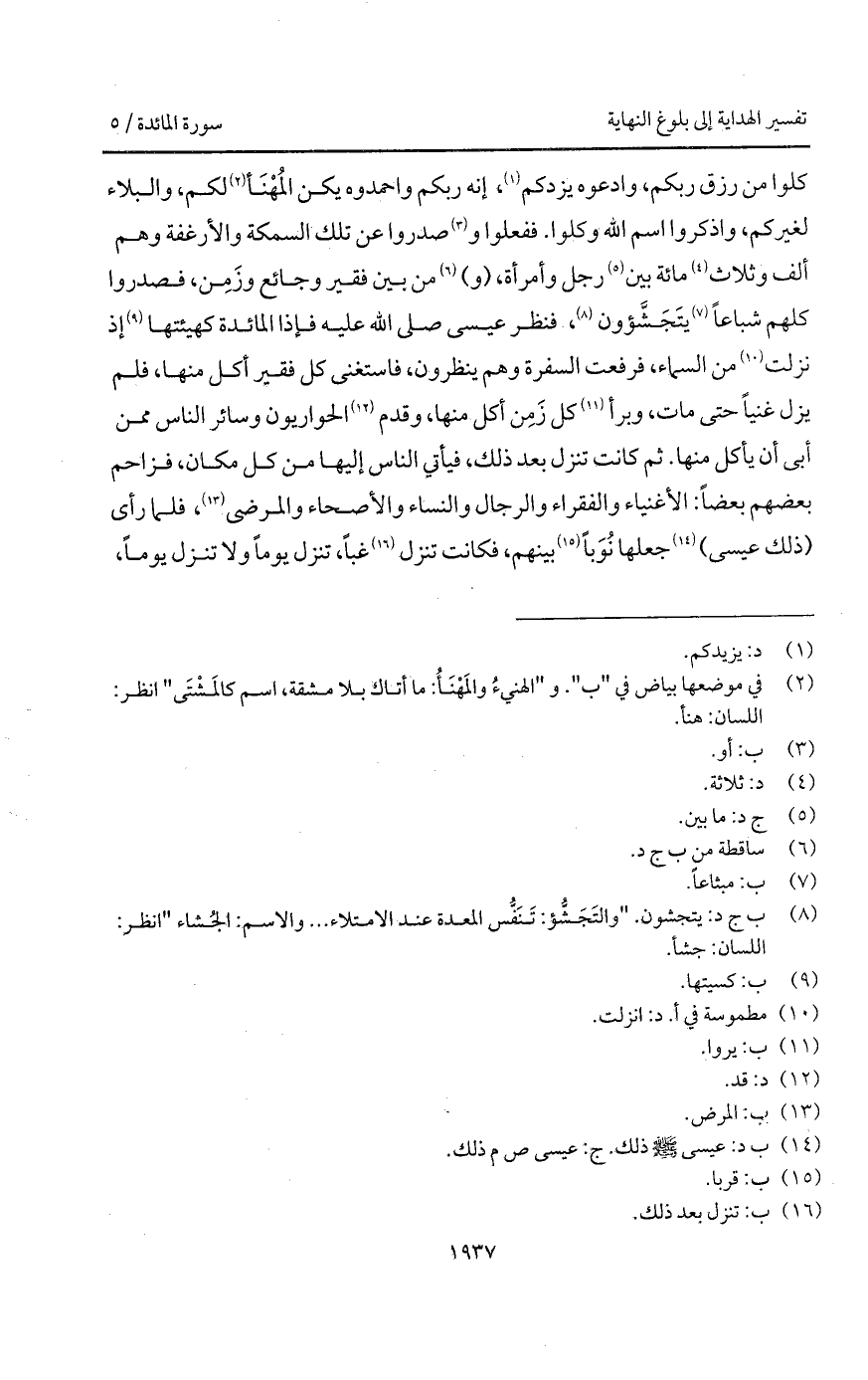 كلوا من رزق ربكم، وادعوه يزدكم، إنه ربكم واحمدوه يكن المُهْنَأ لكم، والبلاء لغيركم، واذكروا اسم الله وكلوا. ففعلوا وصدروا عن تلك السمكة والأرغفة وهم ألف وثلاث مائة بين رجل وأمرأة، (و) من بين فقير وجائع وزَمِن، فصدروا كلهم شباعاً يَتَجَشَّؤون، فنظر عيسى صلى الله عليه فإذا المائدة كهيئتها إذ نزلت من السماء، فرفعت السفرة وهم ينظرون، فاستغنى كل فقير أكل منها، فلم يزل غنياً حتى مات، وبرأ كل زَمِن أكل منها، وقدم الحواريون وسائر الناس ممن أبى أن يأكل منها. ثم كانت تنزل بعد ذلك، فيأتي الناس إليها من كل مكان، فزاحم بعضهم بعضاً: الأغنياء والفقراء والرجال والنساء والأصحاء والمرضى، فلما رأى (ذلك عيسى) جعلها نُوَباً بينهم، فكانت تنزل غباً، تنزل يوماً ولا تنزل يوماً،